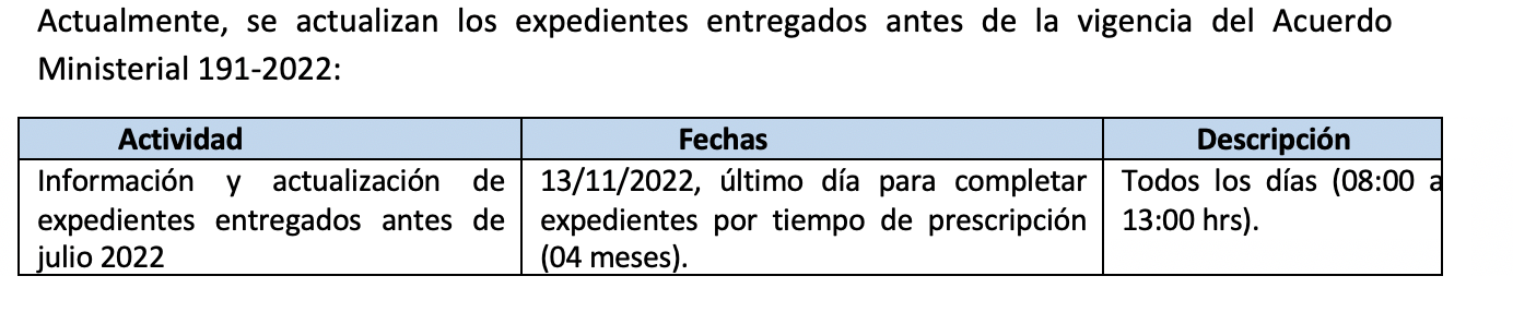 Las autoridades de la Dirección General de Recursos Humanos en Salud, informaron en el mes de agosto de 2022 que, existía un cronograma para atender a todos los interesados en el presente beneficio y las personas que entregaron documentos del 09 de mayo al 19 de diciembre del año 2019, debían presentarse de manera urgente con su copia de recibido, para que se les otorgara información de su expediente.