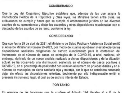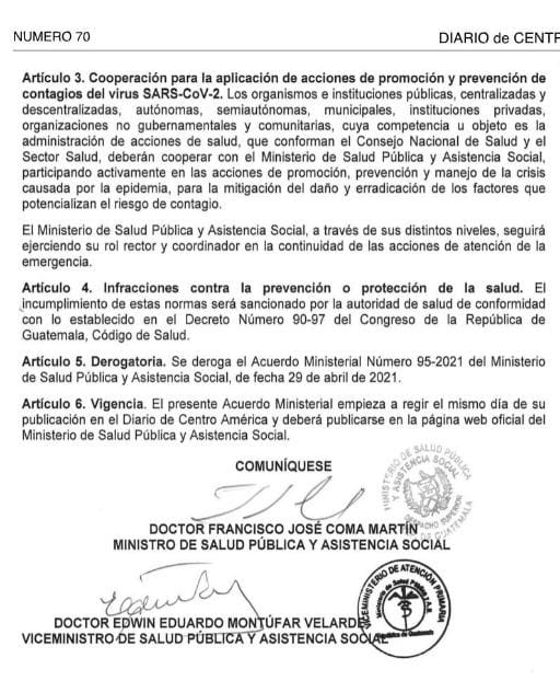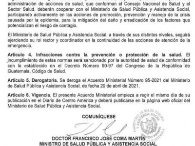 Esta nueva disposición, deroga el Acuerdo Ministerial Número 95-2021 publicado el 29 de abril del presente año y enfatiza en las sanciones que serán impuestas en casos de infracción o incumplimiento de estas normas, de acuerdo a lo establecido en el Código de Salud, siendo el Ministerio de Salud Pública y Asistencia Social el ente rector y sancionador, así como el coordinador en las continuidad de las acciones de atención a esta emergencia.