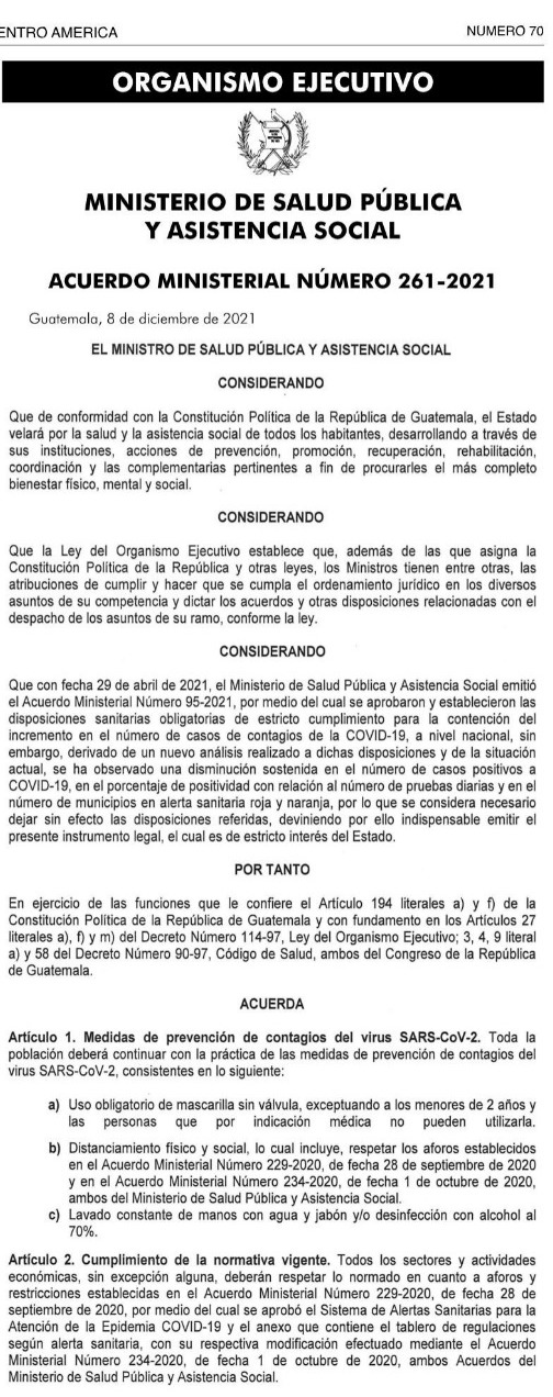 De conformidad a la Constitución política de la República de Guatemala, el Ministerio de Salud Pública y Asistencia Social emitió el Acuerdo Ministerial 261-2021 de fecha 8 de diciembre del año en curso, con el objetivo de dar a conocer las medidas preventivas que estarán vigentes, hasta nuevo aviso, respecto a la emergencia sanitaria por COVID-19.