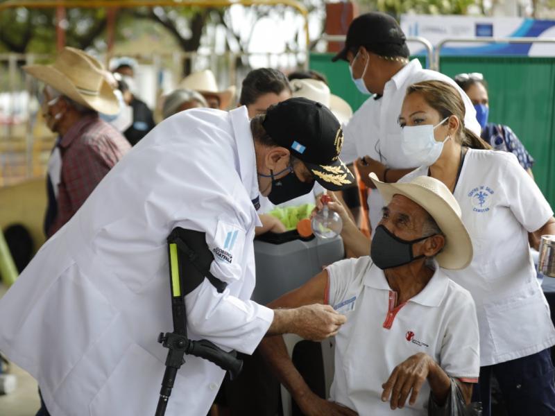 Esta jornada, tuvo lugar en la cancha polideportiva, donde además inmunizar a la población, el presidente Alejandro Giammattei participó en la notificación del Programa del Aporte Económico del Adulto Mayor -PAM- “La vacuna previene complicaciones de la enfermedad, si ustedes se vacunan es el mejor ejemplo que pueden darle a sus nietos y a toda su familia, la vacunación es la solución”, expresó.