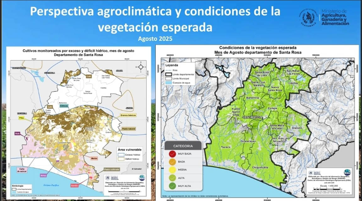 El Centro de Información Estratégica Agropecuaria del MAGA, utilizando imágenes satelitales e información geográfica temática digital, realizó un análisis del estrés vegetal en el departamento, permitiendo identificar áreas con mayor vulnerabilidad productiva. Este insumo técnico permitirá emitir recomendaciones concretas para las prácticas de siembra y manejo de cultivos en el departamento de Santa Rosa.