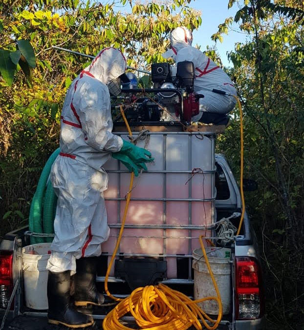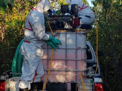 Recientemente se aplicaron 2,000 litros de mezcla Cipermetrina en 100 hectáreas. La aplicación se llevó a cabo con éxito para bajar la densidad poblacional de langostas voladoras, la cual se mantiene bajo control.