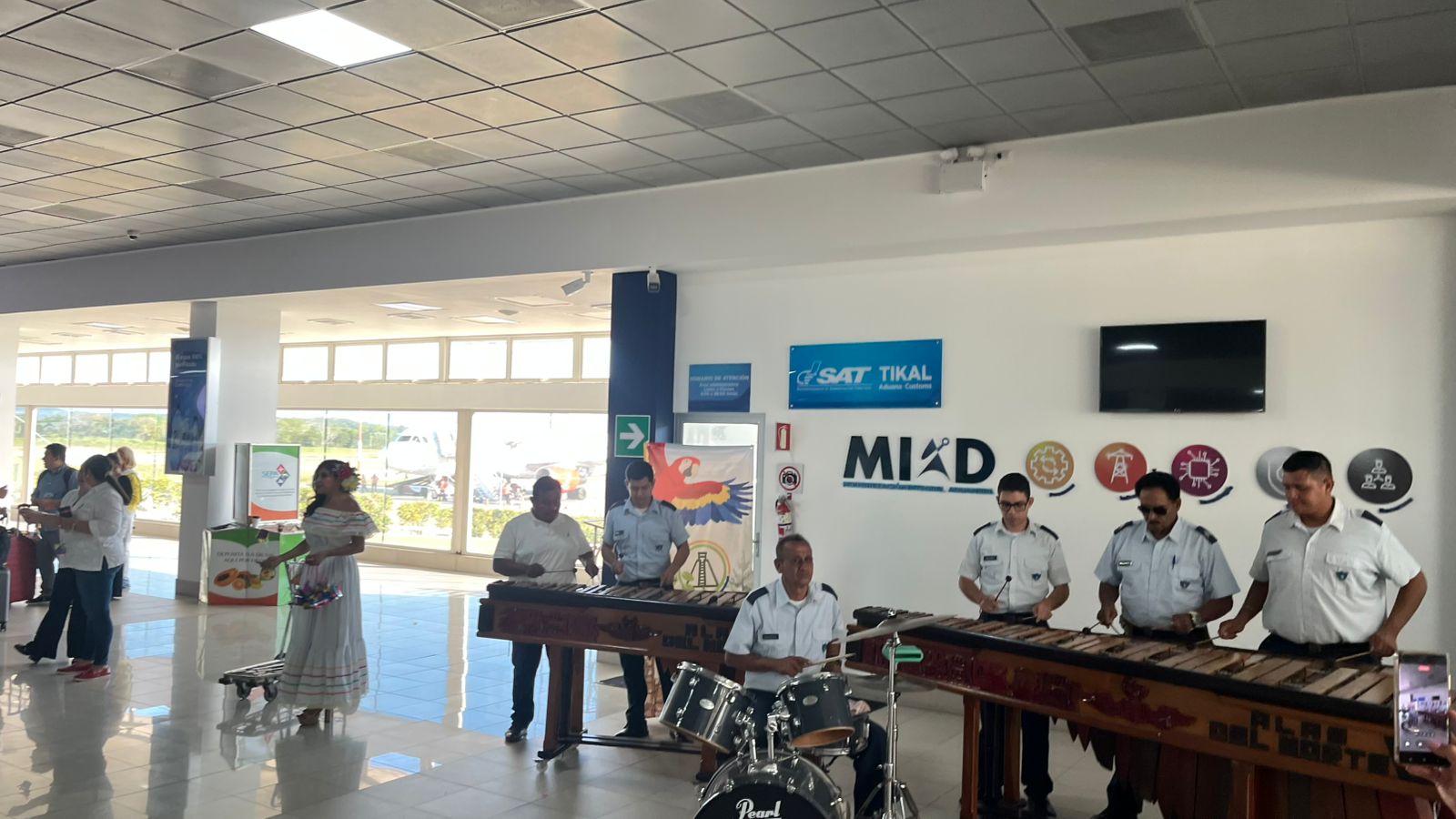 Al son de las teclas morenas, la trompeta, el saxofón, la batería y el trombón, la orquesta Ala del Norte cautivó a los pasajeros, dando una bienvenida que convirtió la llegada al Aeropuerto Internacional Mundo Maya (AIMM) en una experiencia cultural única y memorable para visitantes.