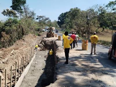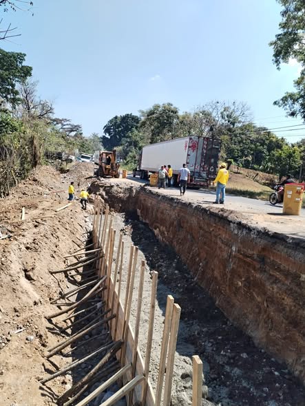 Sobre la CA-2 Occidente en el km 190.3 en Retalhuleu, se trabaja en la fundición de un muro que permitirá recuperar el costado que se socavó al lado derecho de la carretera.