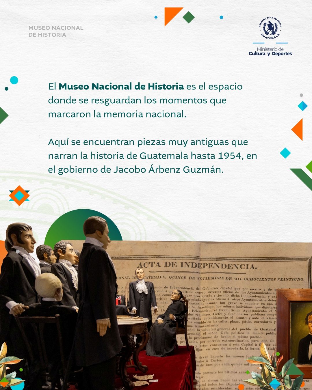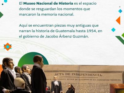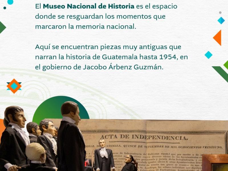 El Museo Nacional de Historia es el espacio donde se resguardan los momentos que marcaron la memoria nacional. Aquí se encuentran piezas muy antiguas que narran la historia de Guatemala hasta 1954, en el gobierno de Jacobo Árbenz Guzmán.