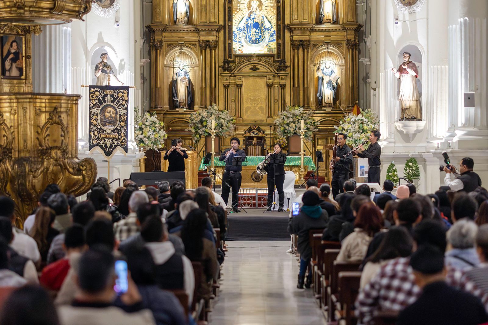 En esta ocasión, subieron al escenario los miembros del Quinteto Xocomil, acompañados por el pianista Junior Medina, quienes ofrecieron al público presente en el templo un notable repertorio, compuesto por piezas de gran belleza y elegancia que, además, remitían a la nostalgia, la sobriedad y el recogimiento.