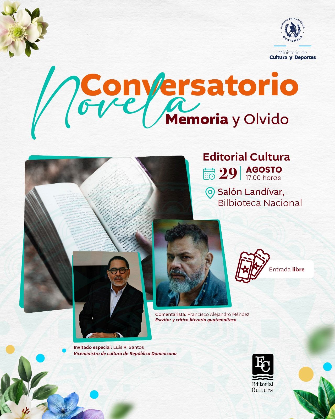El conversatorio “Novela, Memoria y Olvido” reunirá al Premio Nacional de Literatura Francisco Alejandro Méndez y al escritor dominicano Luis Santos Lora. El evento se llevará a cabo el viernes 29 de agosto a las 17:00 horas, en el lobby de la Biblioteca Nacional “Luis Cardoza y Aragón”.