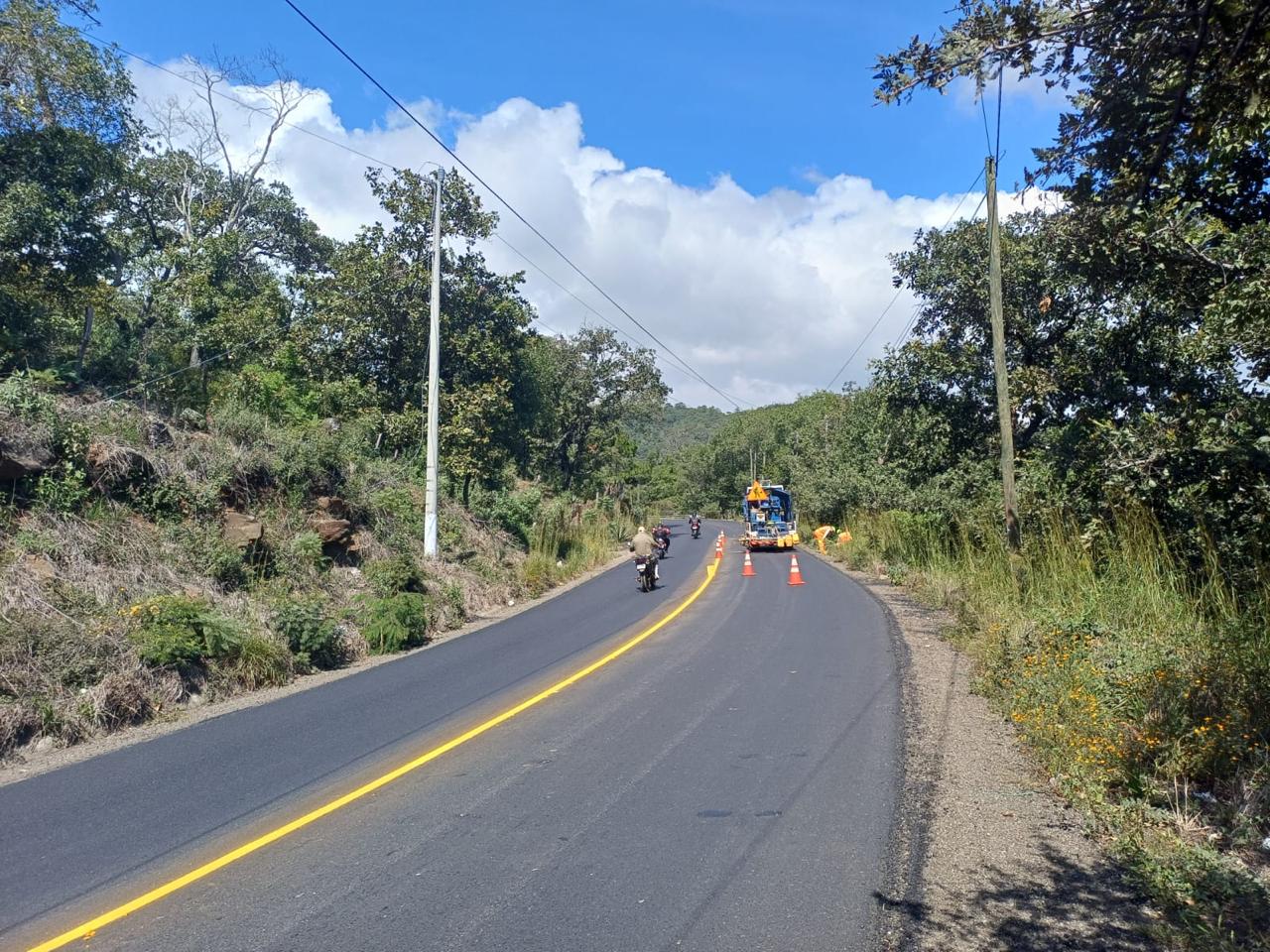 La Dirección General de Caminos aplicó pintura de tránsito amarilla con esfera reflectiva en la línea central, lo que mejora la visibilidad del camino incluso bajo lluvia o poca iluminación.