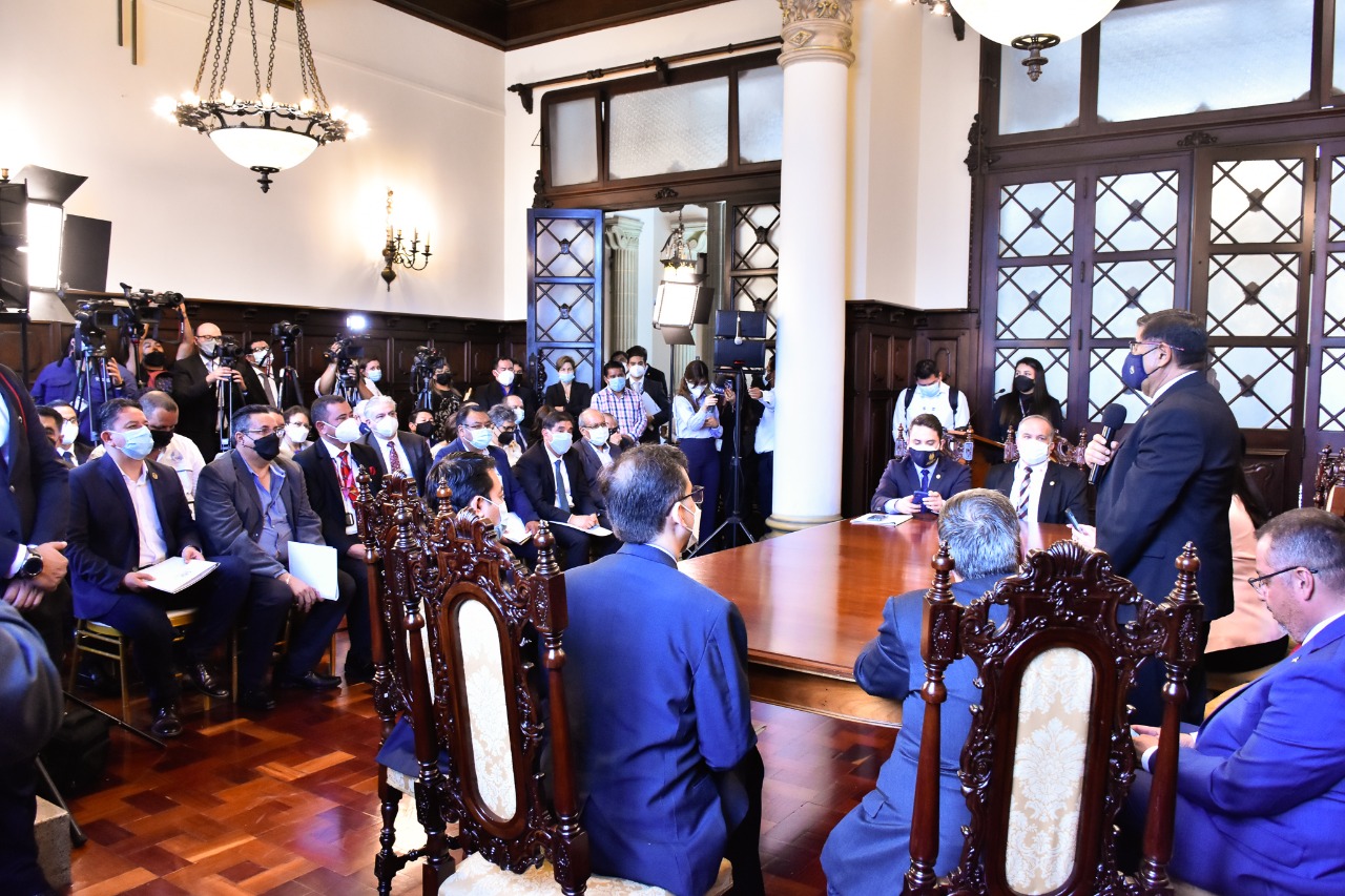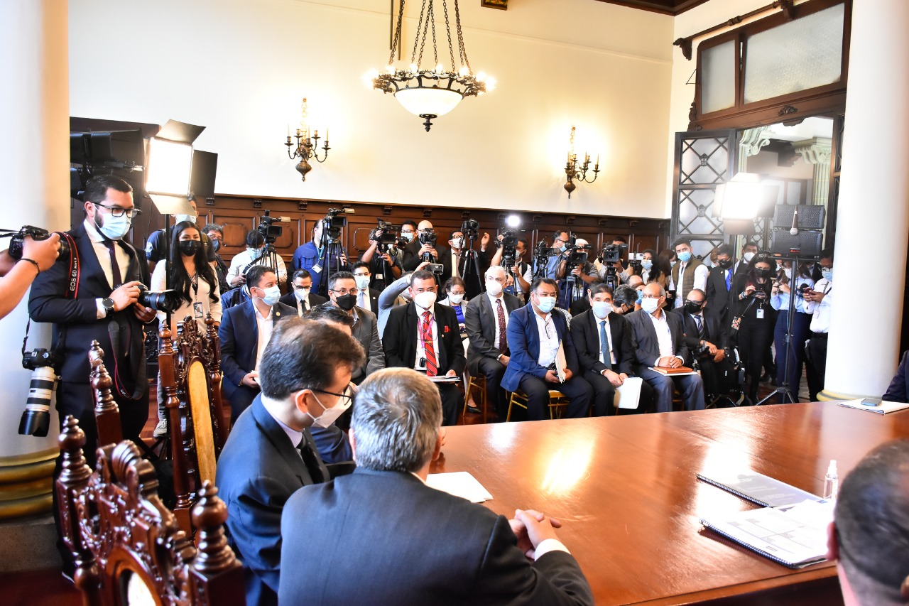 Los ministros Luis Felipe Aguilar, MCD; Raúl Romero Segura MIDES, Claudia Ruiz Casasola, MINEDUC; David Napoleón Barrientos, MINGOB; Mario Rojas, MARN, Rafael Rodríguez, Mintrab; Francisco José Coma, MSPAS, Janio Rosales, MINECO y Javier Maldonado del CIV.