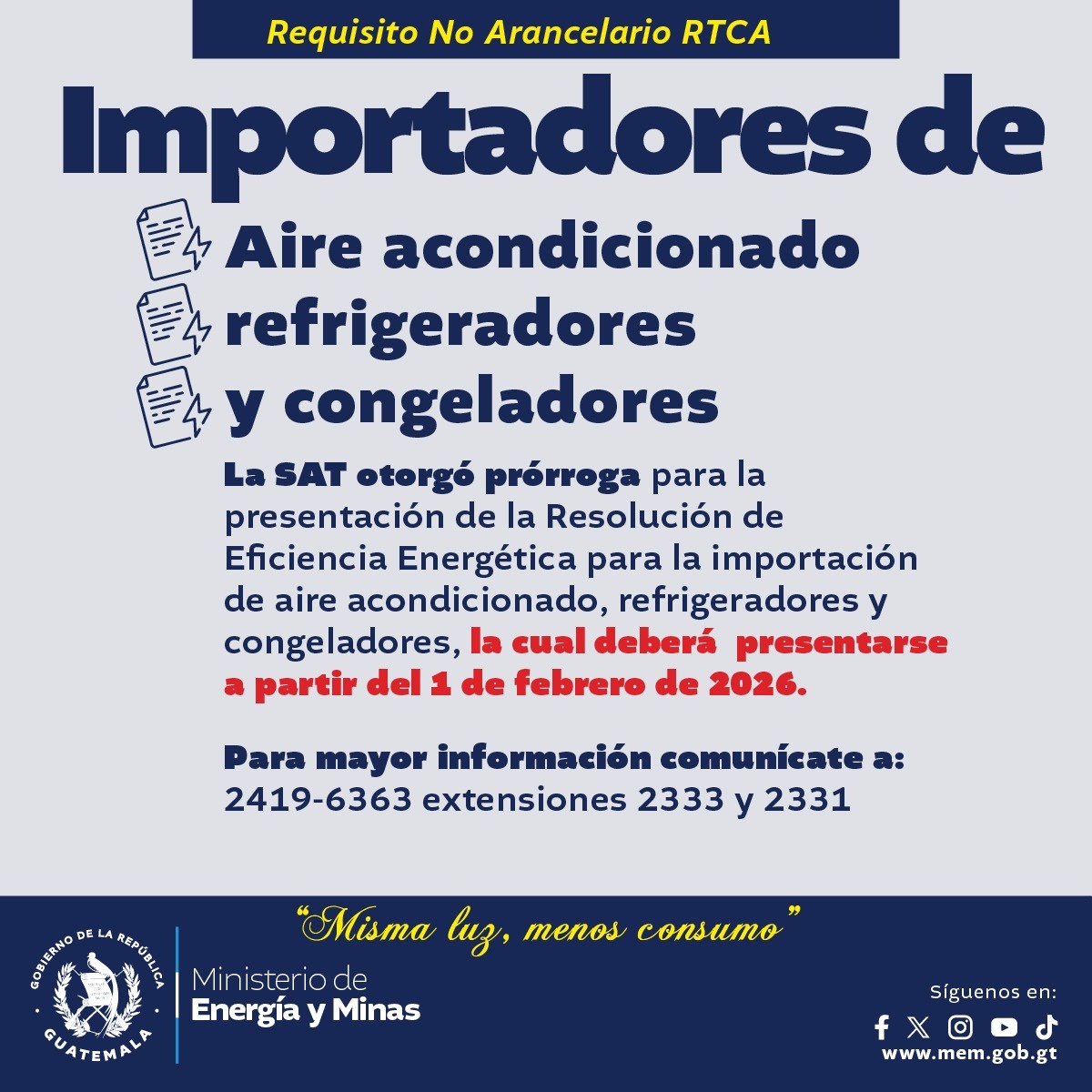 La Superintendencia de Administración Tributaria (SAT) prorrogó la fecha de vigencia para la presentación de la Resolución de Eficiencia Energética como requisito no arancelario para la importación de equipos de aire acondicionado, refrigeradores y congeladores.