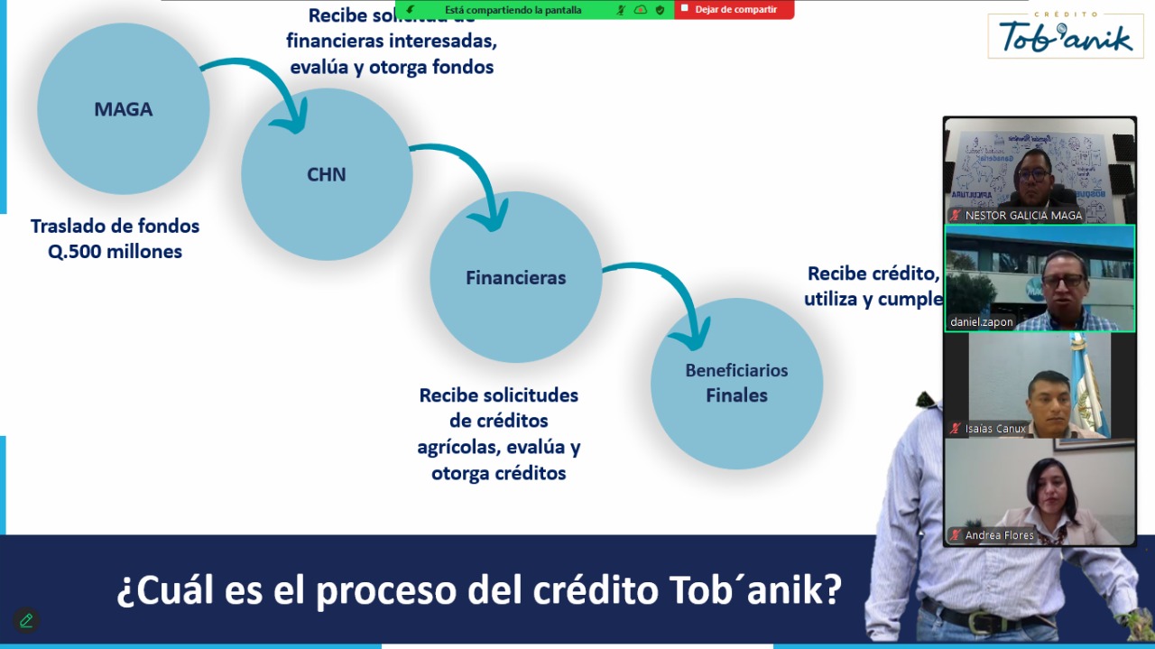 Gran interés y participación despertó el Webinar “Conociendo el Crédito Tobanik”, un espacio informativo que reunió 410 participantes, entre productores, técnicos y representantes de cooperativas e instituciones de todo el país, interesados en conocer los beneficios de este programa impulsado por el Ministerio de Agricultura, Ganadería y Alimentación (MAGA) por medio del Viceministerio de Desarrollo Económico Rural (VIDER).