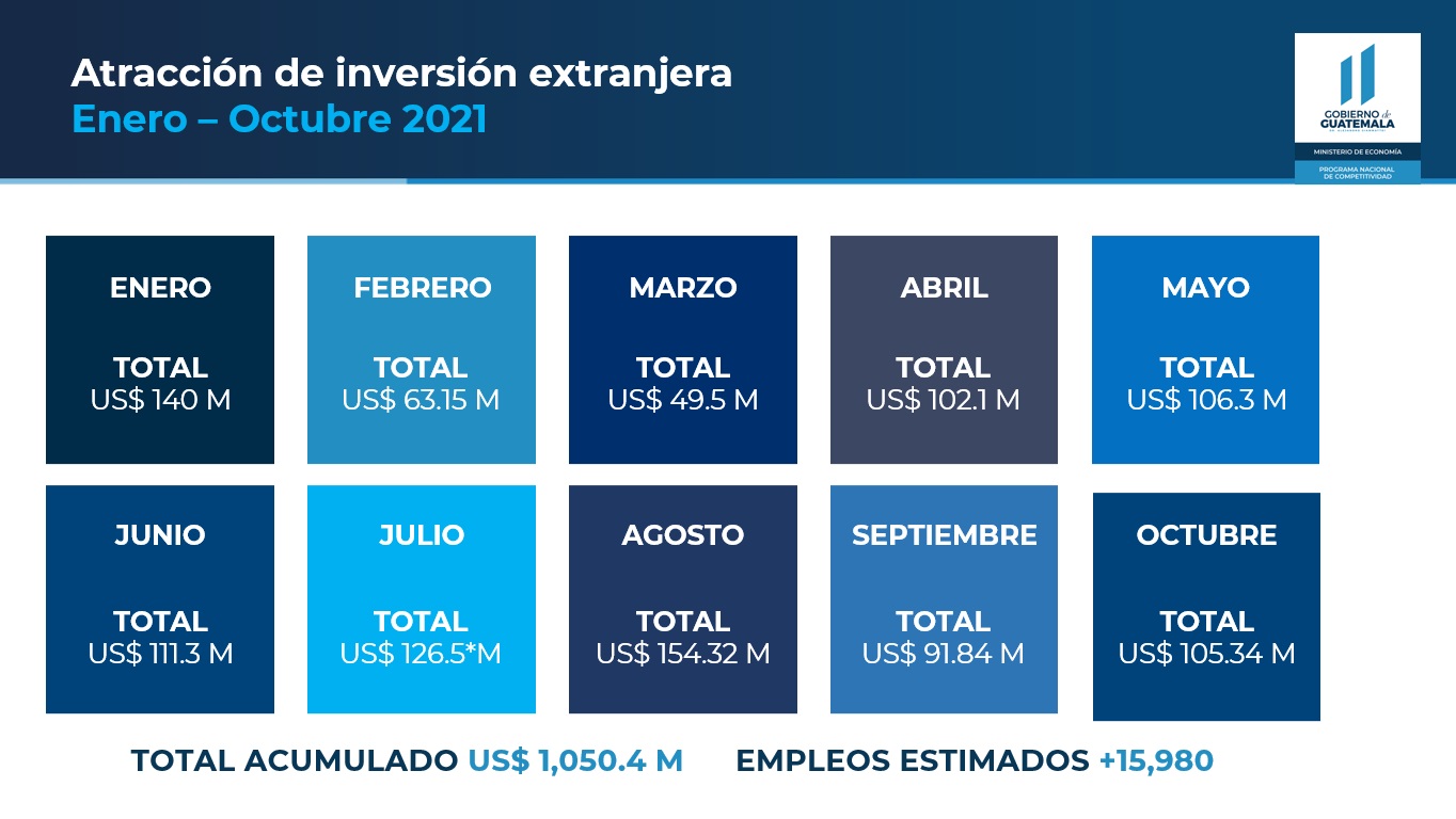 A octubre del 2021, Guatemala atrajo más de mil millones de dólares en concepto de Inversión Extranjera Directa