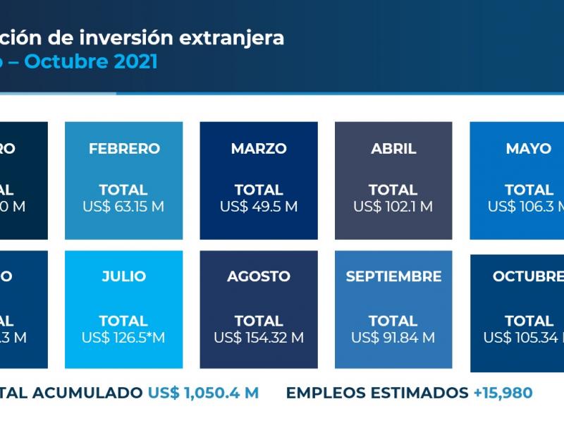 Durante el mes de octubre, se confirmó el inicio de 11 proyectos de inversión y reinversión que representan US$105.34 millones, los cuales generarán un estimado de 400 nuevos empleos. Nueve de estos proyectos corresponden a reinversiones en los sectores de comercio, servicios, infraestructura, manufactura; y dos nuevas inversiones en los segmentos de comercio y servicios.