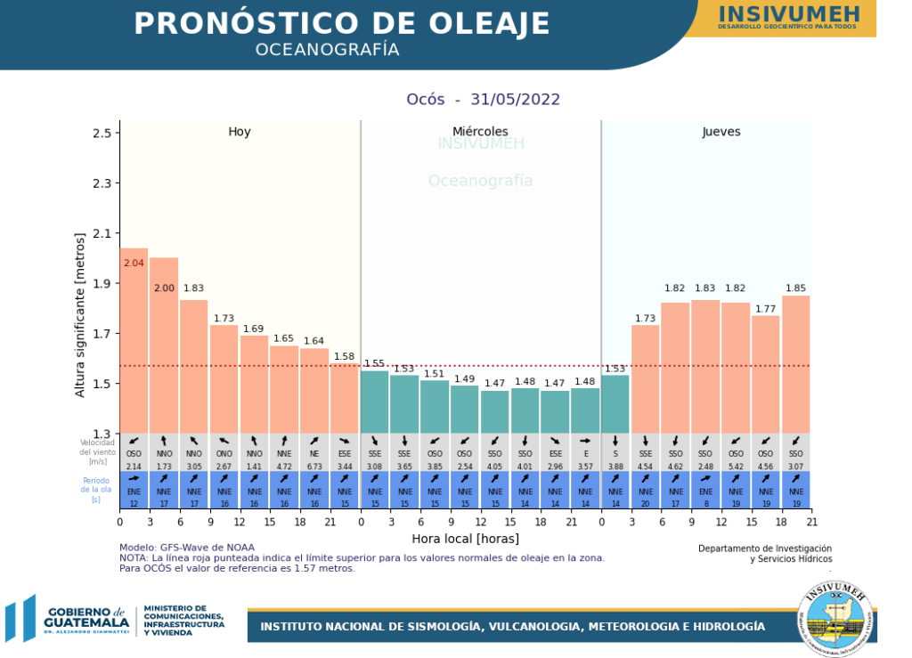 El INSIVUMEH, ente científico del Sistema CONRED, agregó en su Pronóstico de Oleaje que, se prevé un incremento de oleaje en Ocós para el jueves 02 de junio de 2022.