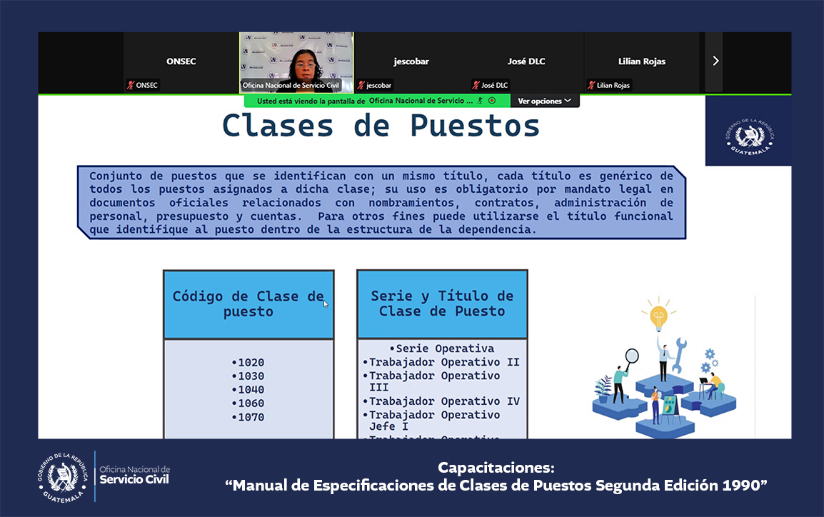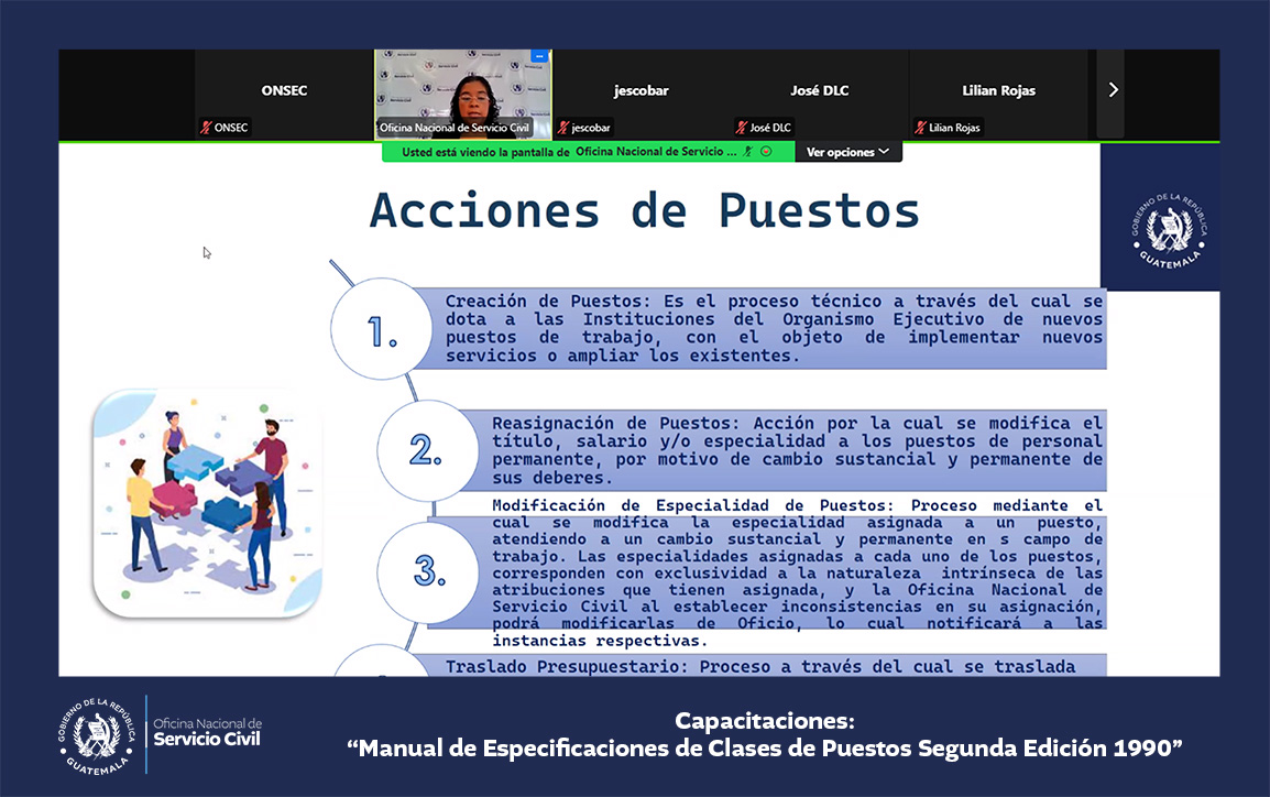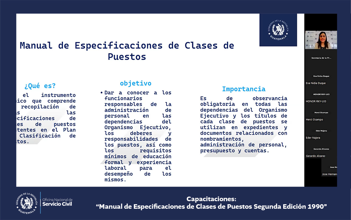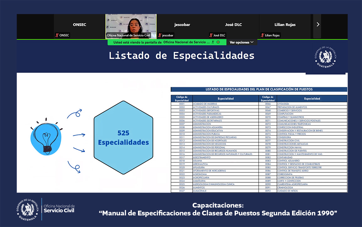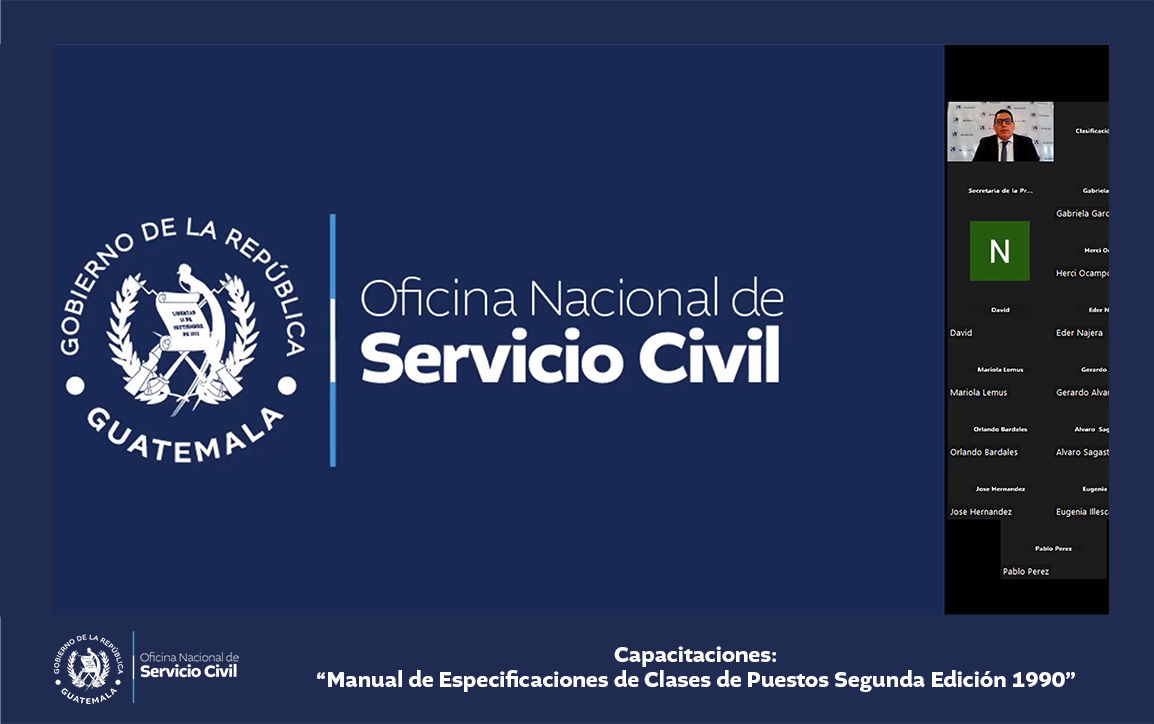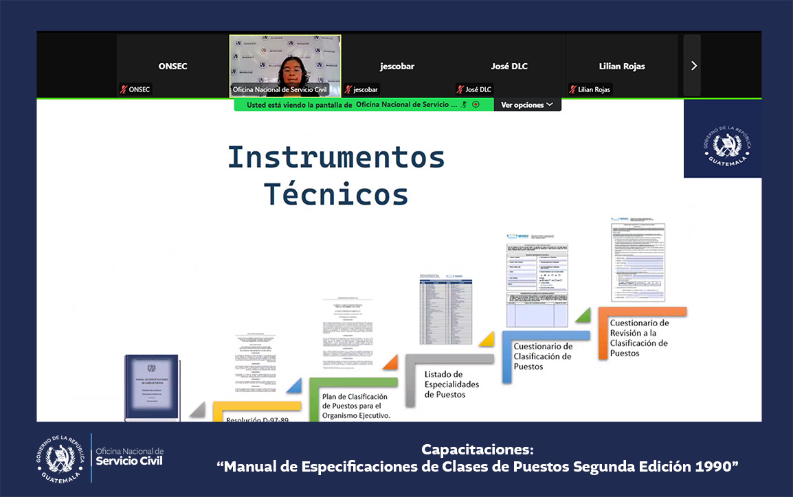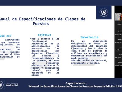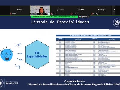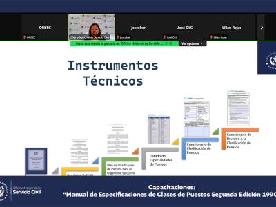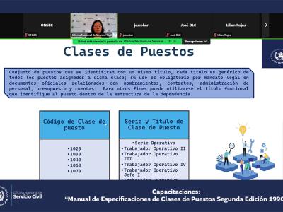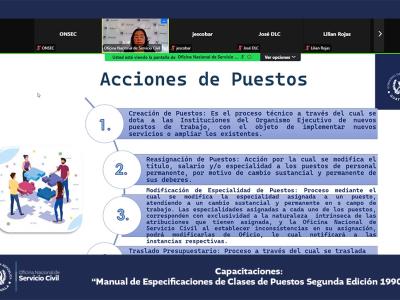 La Oficina Nacional de Servicio Civil -ONSEC- brindó una capacitación virtual acerca del Manual de Especificaciones de Clases de Puestos, segunda edición 1990, dirigida a ministerios y secretarías del Estado.