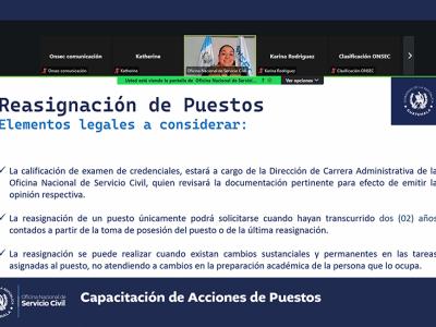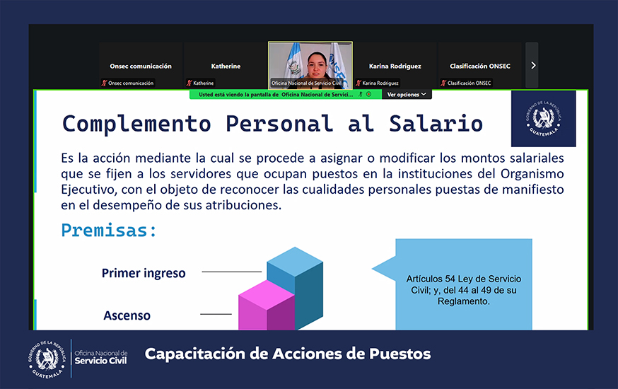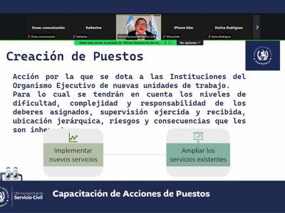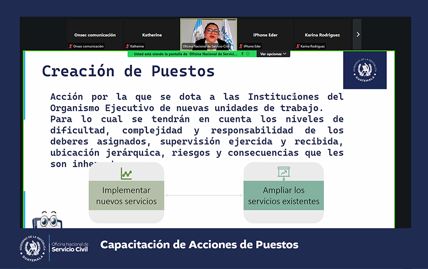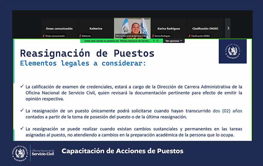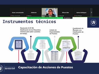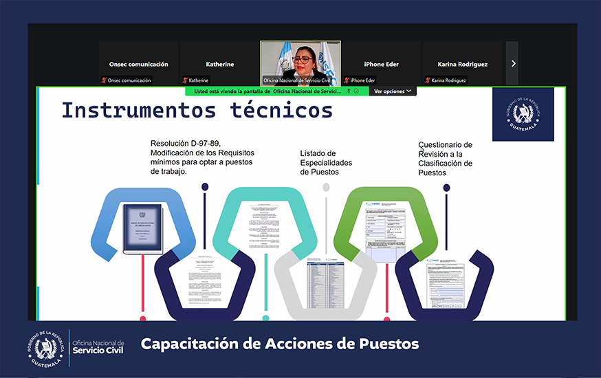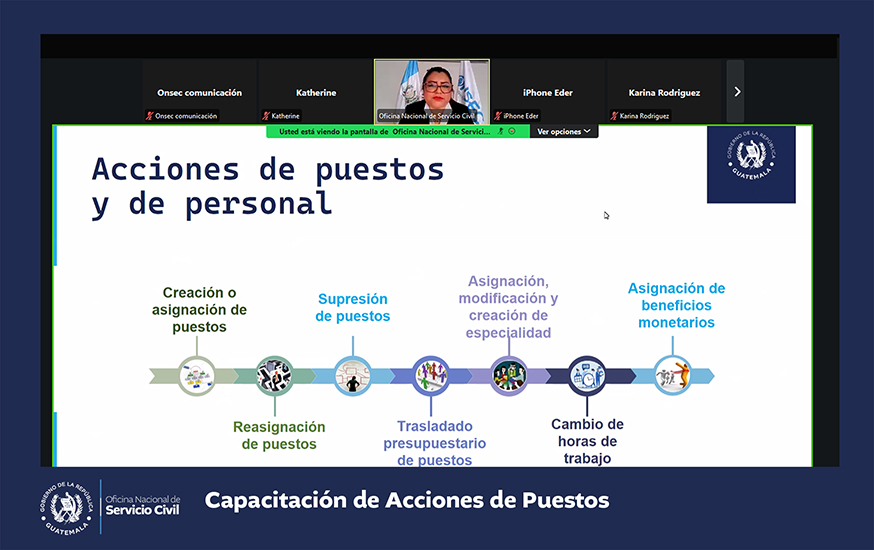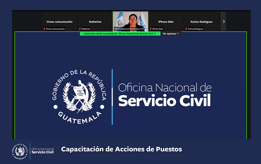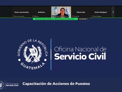 La Oficina Nacional de Servicio Civil -ONSEC- brindó una capacitación virtual acerca de acciones de puestos que fue dirigida a instituciones del Organismo Ejecutivo y las entidades descentralizadas y autónomas del Estado que se rigen por la Ley de Servicio Civil y su Reglamento.