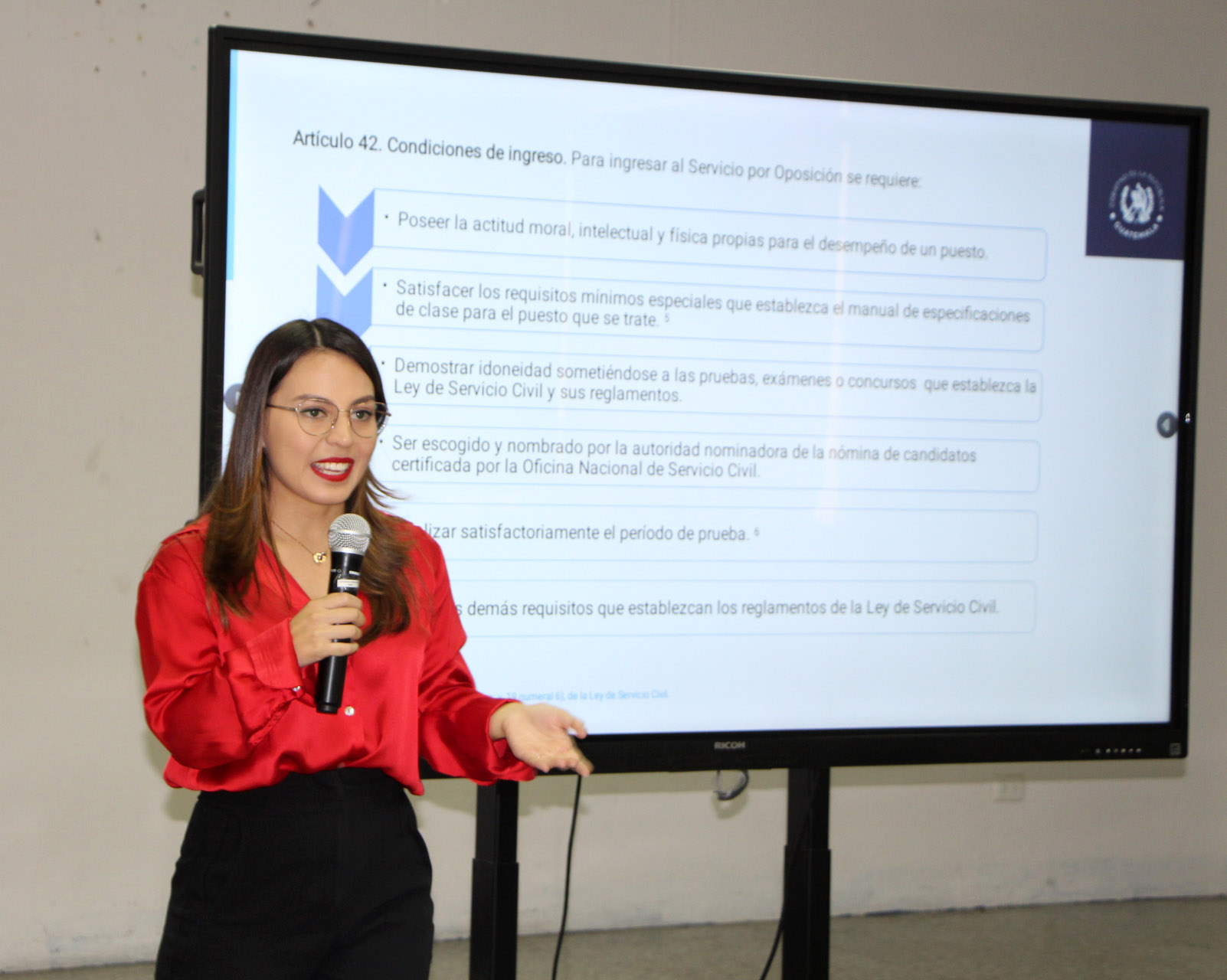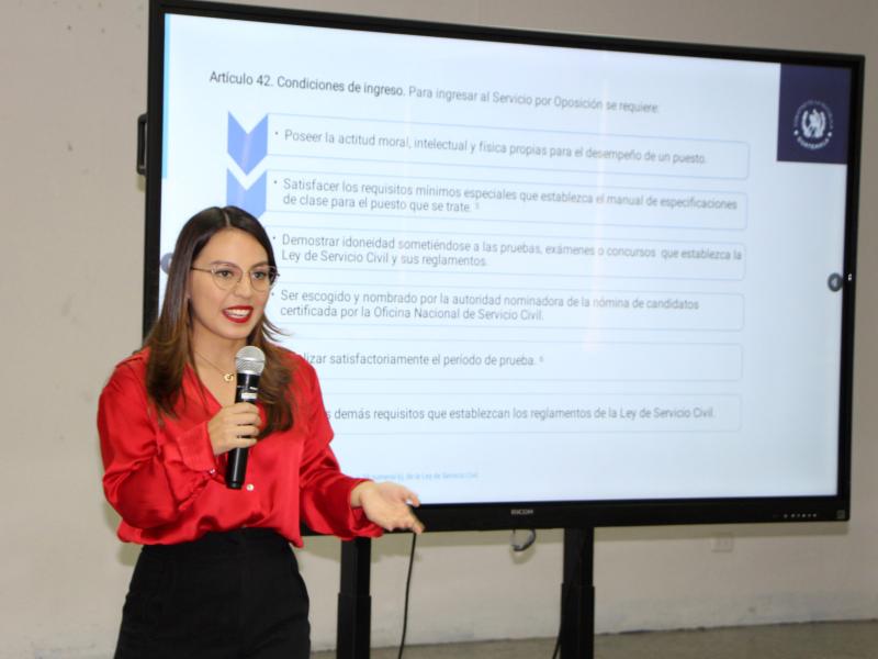 La expositora fue la licenciada Lisseth Mejía, quien dio detalles de la base legal del proceso de dotación de recursos humanos y las etapas del mismo, entre las que se pueden mencionar: la requisición de personal, la publicación de convocatoria y la recepción de documentos.