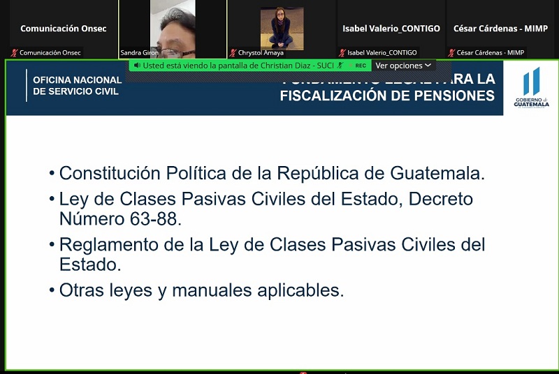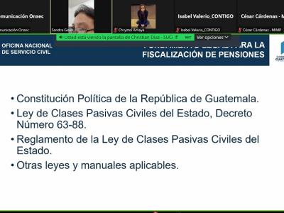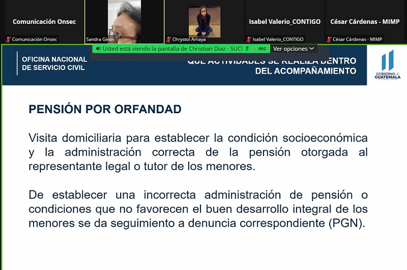 En el caso específico de la experiencia guatemalteca, la Directora de Previsión Civil comenzó con explicar que la pensión civil por orfandad y extensión a la orfandad que autoriza la Onsec está regulada en la Ley de Clases Pasivas Civiles del Estado y su Reglamento.