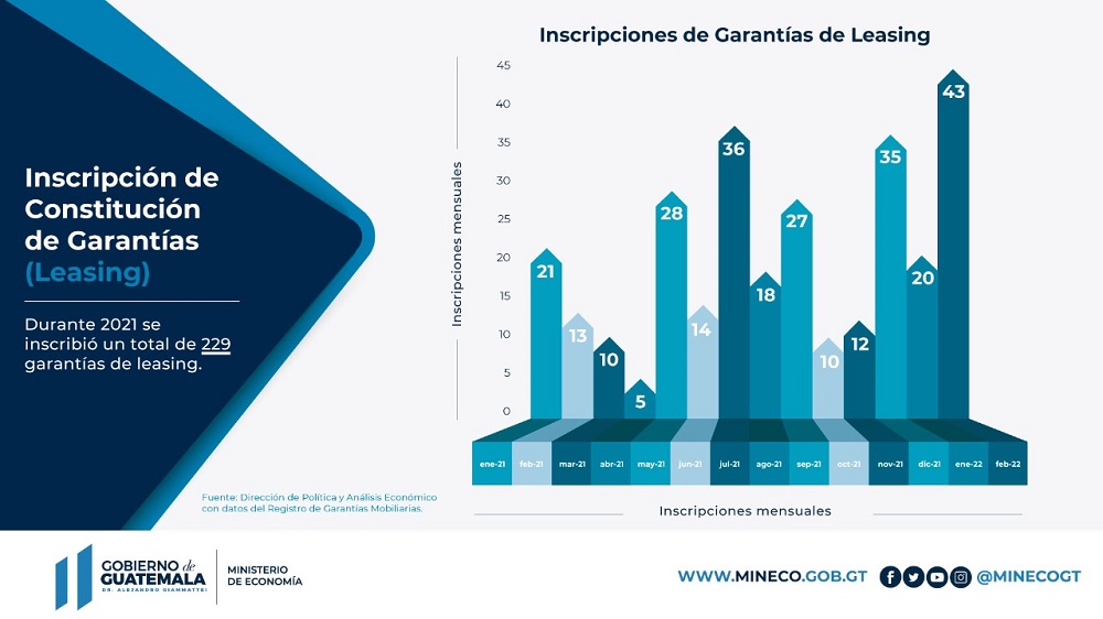 A un año de la aprobación de la Ley de Leasing, las inscripciones de Leasing en el Registro de Garantías Mobiliarias incrementaron en 230%, apuntalando los esfuerzos de recuperación económica, implementados por el Gobierno del Dr. Alejandro Giammattei.