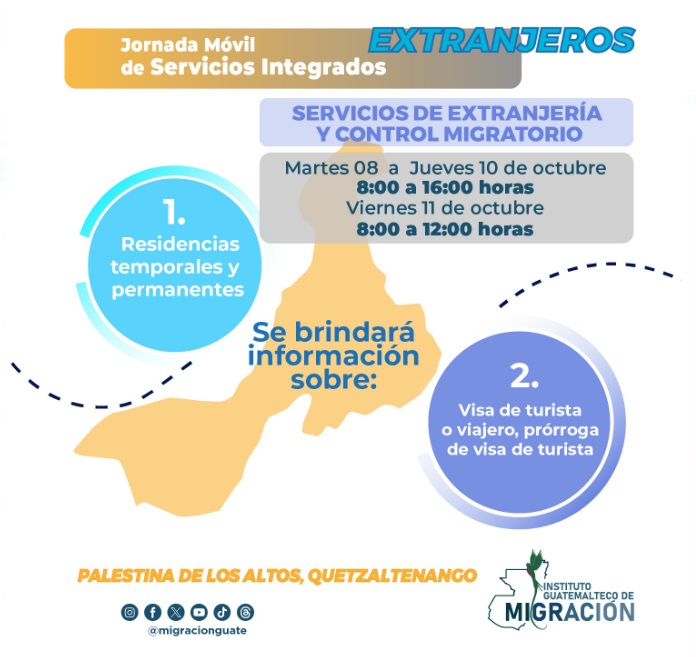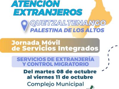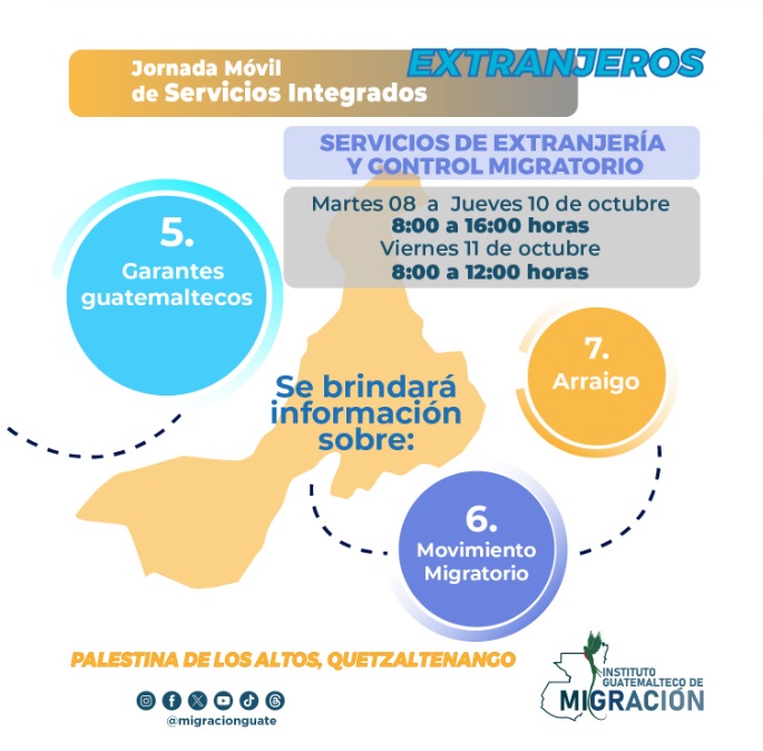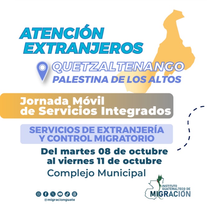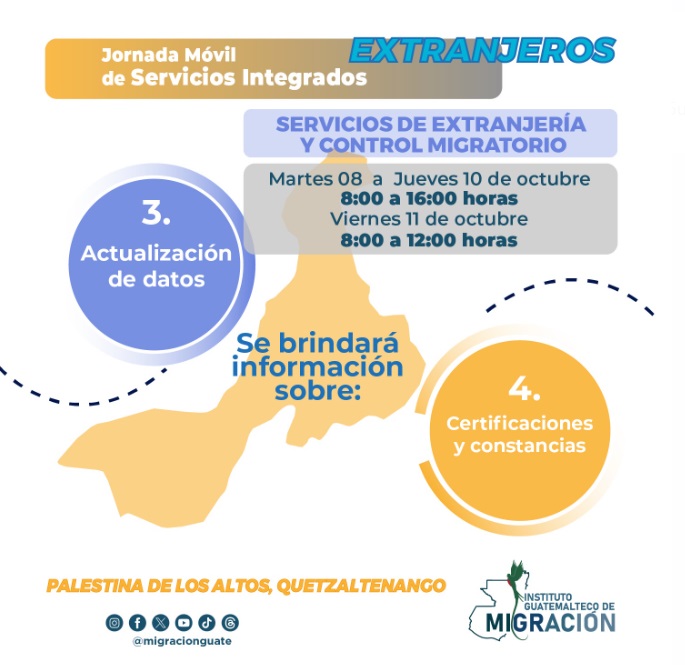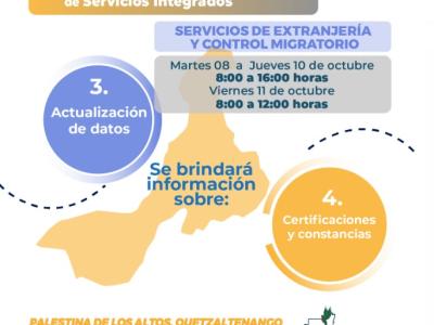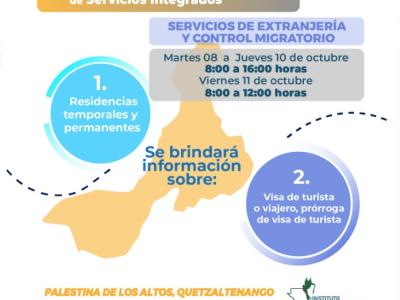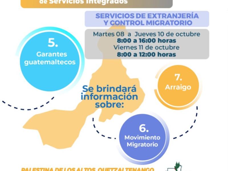 El Instituto Guatemalteco de Migración participará proporcionando información sobre servicios migratorios a los extranjeros residentes en Quetzaltenango. Entre ellos, los requisitos para obtener residencias temporales o permanentes, actualizaciones de datos y solicitudes de visas- Además, ofrecerá información sobre el proceso de solicitud de certificaciones de arraigos y movimientos migratorios en línea.