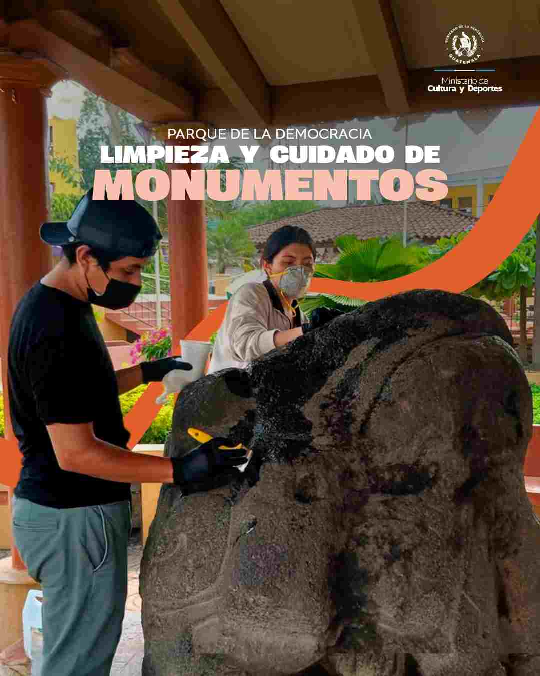 El Museo Regional de Arqueología de La Democracia “Rubén Chévez Van Dorne”, en Escuintla, desarrolló una jornada de limpieza y cuidado de los monumentos del parque de La Democracia, en conjunto con estudiantes de la carrera del Técnico en Restauración de Bienes Muebles de la Universidad de San Carlos de Guatemala (USAC).