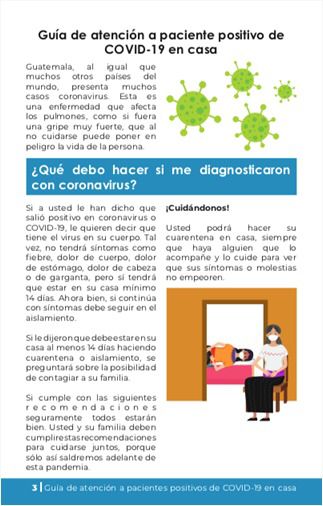 Este material, fue proporcionado a las 29 Áreas de Salud de manera física y digital, para que fuera socializado al personal, quienes replicaron el contenido, tomando en cuenta factores idiomáticos y de pertinencia cultural. Todo esto, gracias al Departamento de Promoción y Educación en Salud –PROEDUSA-, que ha establecido nexos con instituciones y cooperantes internacionales para la reproducción de esta guía y su acercamiento a las áreas rurales.