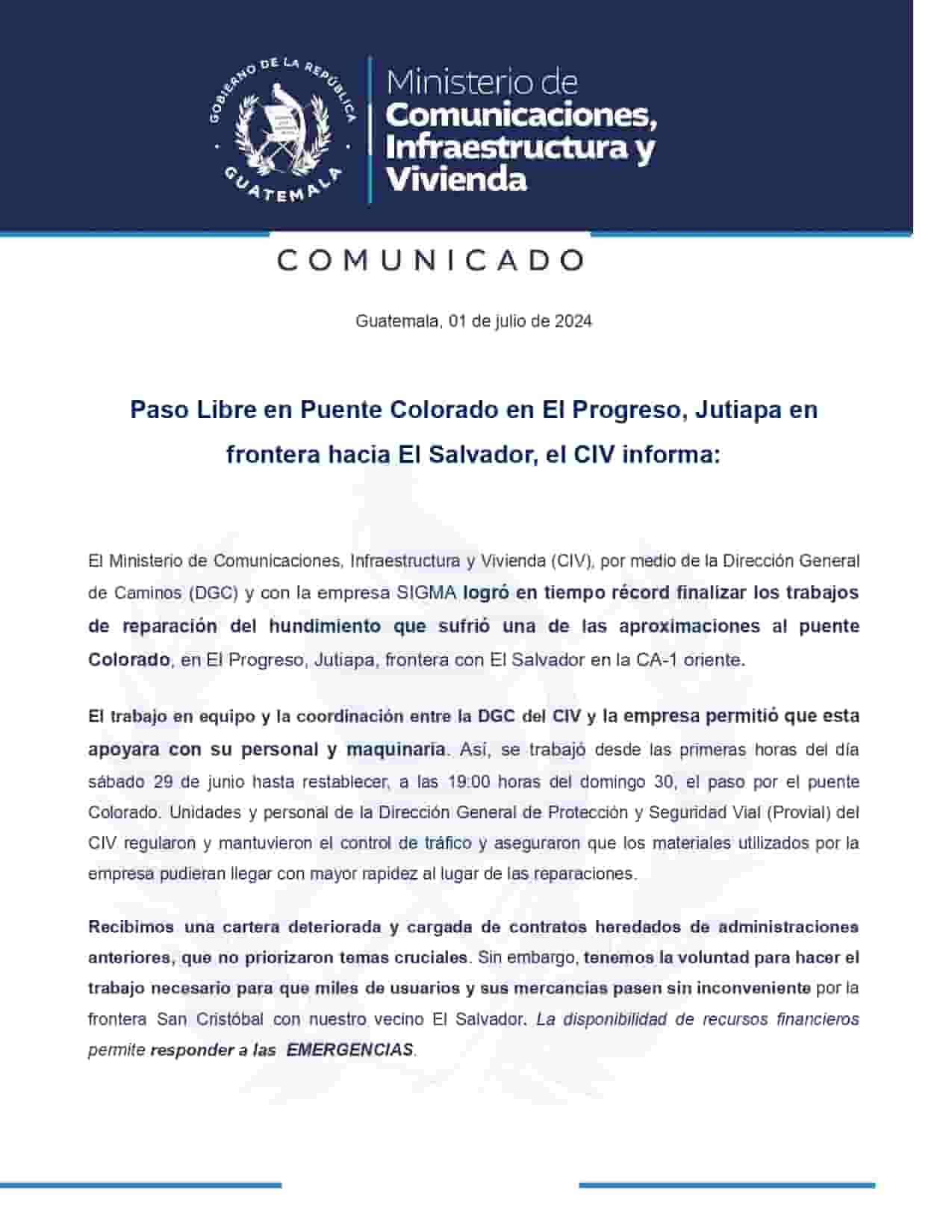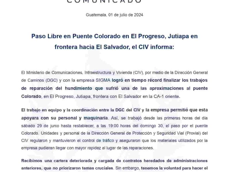 El Ministerio de Comunicaciones, Infraestructura y Vivienda (CIV), por medio de la Dirección General de Caminos (DGC) y con la empresa SIGMA logró en tiempo récord finalizar los trabajos de reparación del hundimiento que sufrió una de las aproximaciones al puente Colorado, en El Progreso, Jutiapa, frontera con El Salvador en la CA-1 oriente.