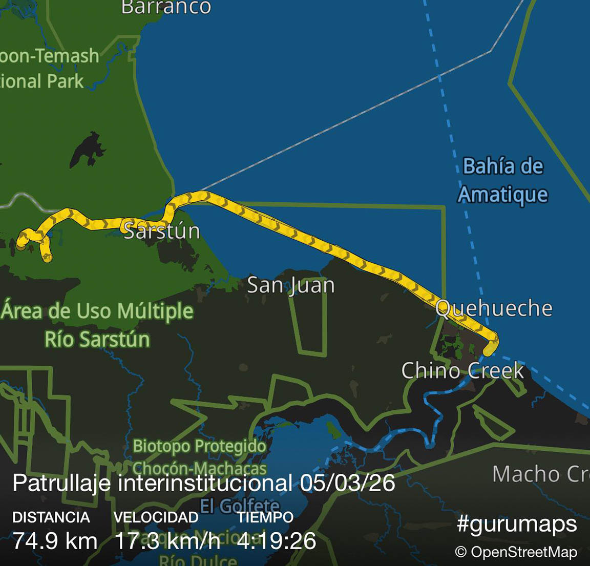 El patrullaje incluyó un recorrido acuático desde la desembocadura del Río Dulce, a la altura de Livingston, en el departamento de Izabal, hacia el interior del Río Sarstún, con el propósito de verificar el cumplimiento de las prohibiciones y regulaciones establecidas por las instituciones participantes.