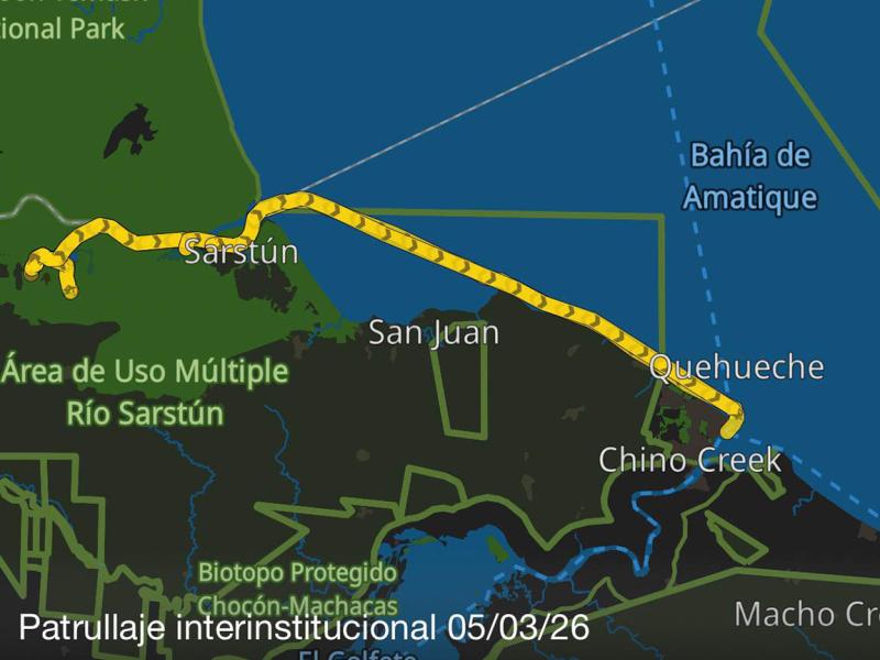 De manera paralela, las autoridades efectuaron un recorrido terrestre hasta la comunidad Playa Cerro Blanco, en el área de Sarstún, para dar seguimiento a una denuncia relacionada con la presunta caza ilegal de vida silvestre en el sector.