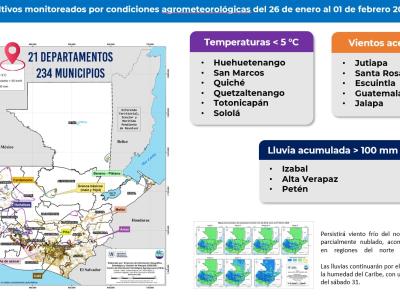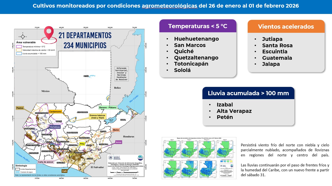 El análisis de monitoreo climático, con base en la información climática generada por el Instituto Nacional de Sismología, Vulcanología, Meteorología e Hidrología (INSIVUMEH), abarca 234 municipios. En estos se identificó vulnerabilidad en cultivos estratégicos como maíz, frijol, hortalizas, banano, plátano, cardamomo, piña, melón y arroz, los cuales pueden verse afectados por las bajas temperaturas, que iniciaron la semana anterior.