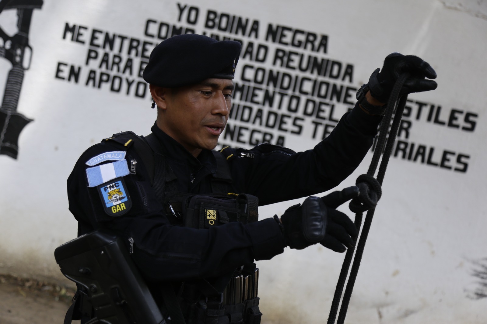 El instructor es agente de la PNC quien pertenece al Grupo de Acción Rápida (GAR) y del Grupo de Búsqueda y Rescate (GBR). Durante las sesiones de entrenamiento, los agentes están aprendiendo a elaborar distintos tipos de nudos, como el ocho, el siete, el nudo pescador, el nudo cuadrado, ballestrinque, entre otros, que les serán útiles en diferentes situaciones, para hacer escaleras, en rescates, efectuar anclajes y arneses improvisados.