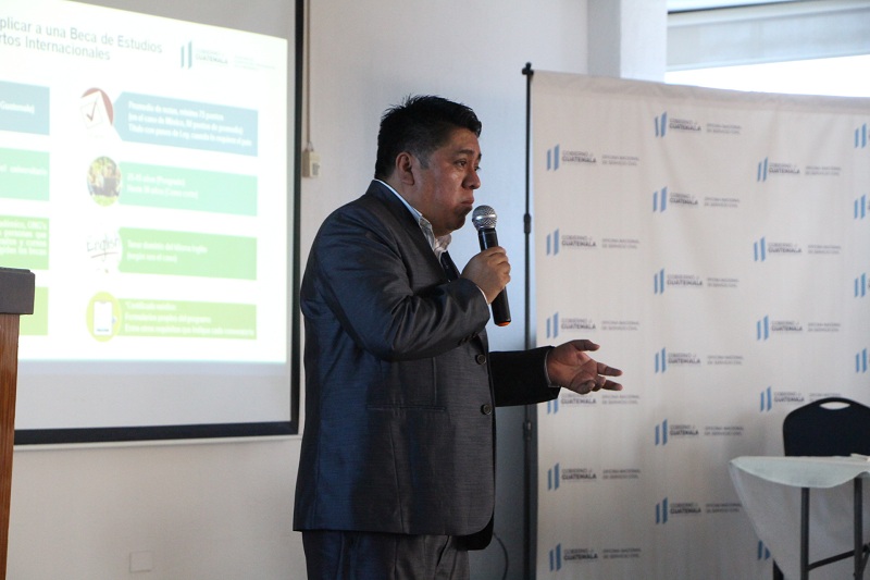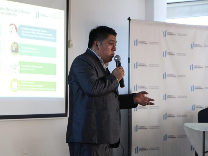 El licenciado Nelson Méndez, de la Dirección de Becas y Crédito Educativo de SEGEPLAN, estuvo a cargo de la sesión informativa. Explicó que existen becas parciales y totales para los niveles de licenciatura, maestría y doctorado que se facilitan por cooperantes de diferentes países, entre ellos, Japón, Chile, España, Reino Unido, Alemania, República de China (Taiwán) y Corea del Sur.