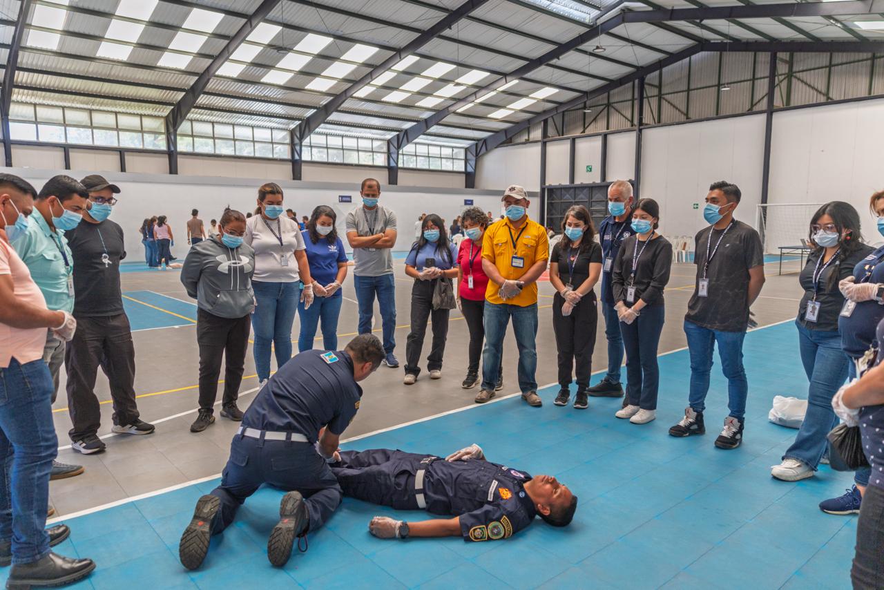 En el Parque Erick Barrondo, trabajadores y trabajadoras participaron en la primera fase de capacitación en primeros auxilios, impartida por los Bomberos Municipales Departamentales, como parte del fortalecimiento de capacidades para la atención de emergencias.