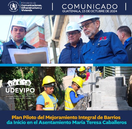 El Viceministerio de Desarrollo Urbano y Vivienda del Ministerio de Comunicaciones, Infraestructura y Vivienda —CIV—, en cumplimiento del acuerdo ministerial 560-2024, desarrolla un proyecto piloto de dicha política, comenzando con la gestión de riesgos. En este contexto, se están construyendo más de 3,412 metros cuadrados de muros de contención para proteger la vida de 273 familias que habitan dentro del asentamiento María Teresa Caballeros, ubicado en la zona 7 de la ciudad de Guatemala. Una vez garantizada la seguridad, se llevarán a cabo: la regularización de la tenencia de la tierra a través de la escrituración masiva, la mejora de las condiciones de las viviendas, el desarrollo de equipamiento recreativo, social y cultural, y la optimización del acceso a servicios básicos. Se implementarán además iniciativas para fortalecer el tejido social y promover la convivencia pacífica. Este plan prevé la colaboración de diversas instituciones, que trabajan en equipo para conseguir el bienestar común de las familias.