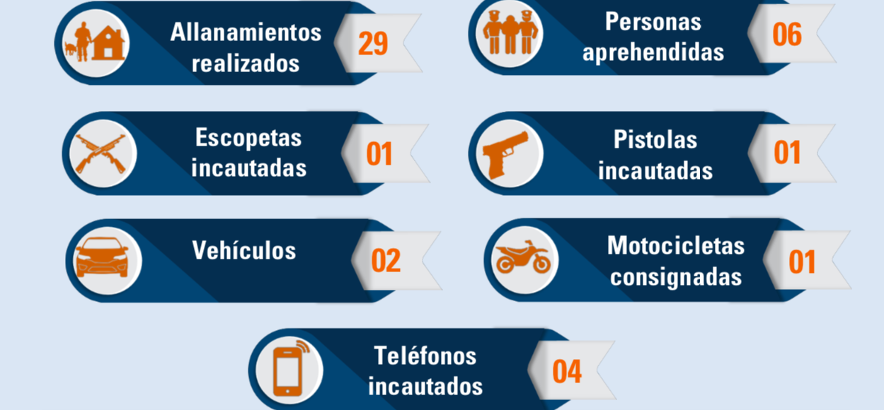Las autoridades indicaron que, en los operativos se incautaron 2 vehículos, una pistola, una escopeta, una motocicleta y 4 celulares.