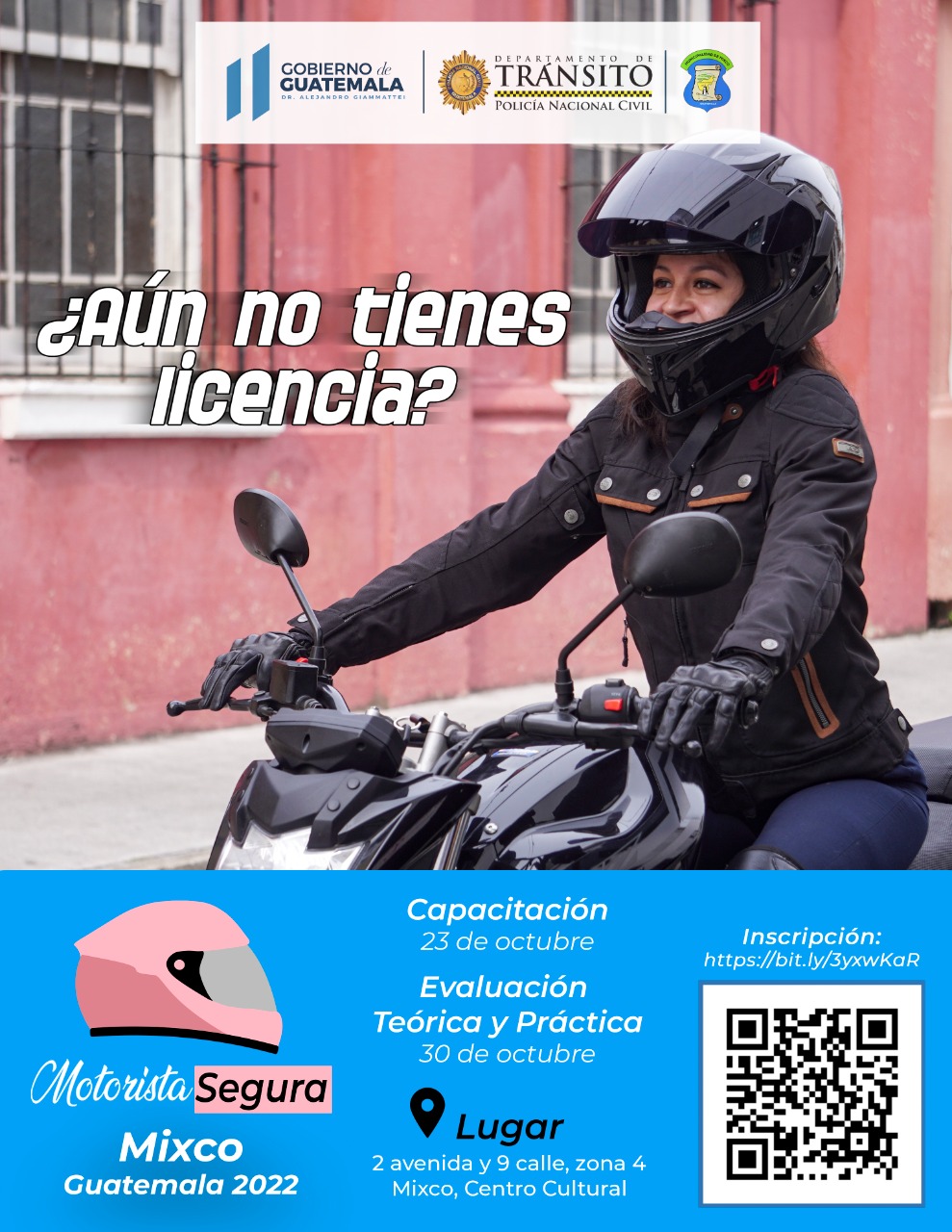 El Departamento de Tránsito de la Policía Nacional Civil realizó este día el lanzamiento del proyecto Motorista Segura. El objetivo es que las mujeres obtengan la licencia tipo M. La actividad se realizó en el domo del Estadio Santo Domingo de Guzmán, Mixco, Guatemala.