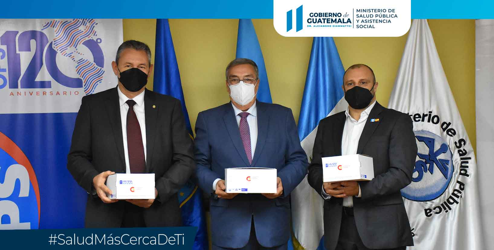 En la entrega oficial de equipo y suministros, participó el ministro de Salud, Francisco Coma; el representante de OPS en Guatemala, Dr. Gerardo Alfaro; y por parte de AECID/ Cooperación Española estuvo presente David Montesinos, Responsable del Programa.