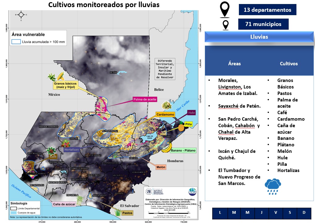 La Dirección de Información Geográfica Estratégica y Gestión de Riesgo (DIGEGR), por medio del Mapa de Cobertura Vegetal, monitorea los departamentos de Izabal, Petén, Alta Verapaz, Quiché y San Marcos, en dónde hay cultivos de granos básicos, pastos, palma de aceite, café, cardamomo, caña de azúcar, banano, plátano, melón, hule, piña, hortalizas.