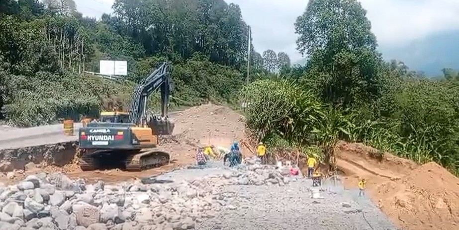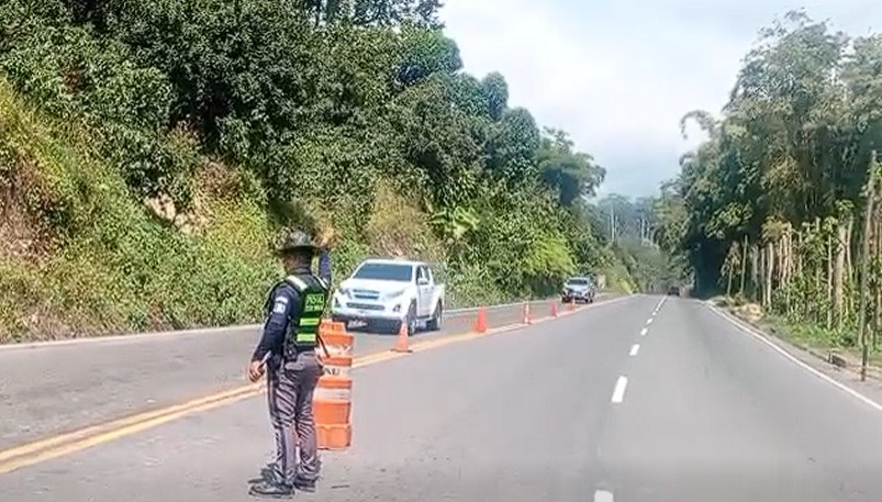 Brigadas de la Dirección General de Protección y Seguridad Vial (Provial) regulan el tránsito vehicular debido a los trabajos que realiza la Unidad Ejecutora de Conservación Vial (Covial) en el km. 194 de ruta CITO-180 (El Palmar, Quetzaltenango), donde se alterna el paso de vehículos.