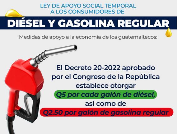 El Decreto 20-2022 establece otorgar un subsidio de Q5 por galón de diésel y Q2.50 por galón de gasolina regular.