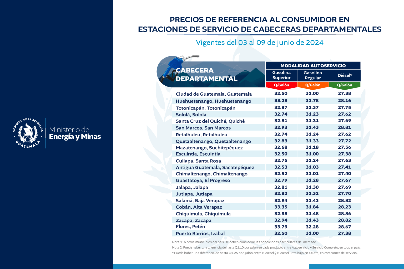Precios de referencia al consumidor en estaciones de servicio de cabeceras departamentales vigentes del 03 al 09 de junio de 2024