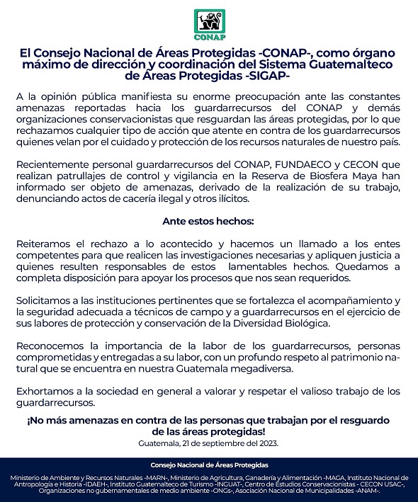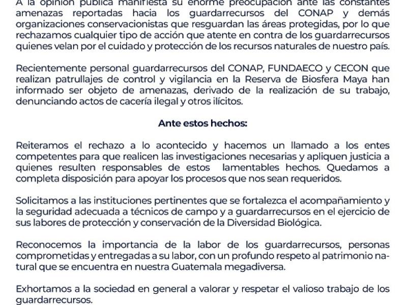 A la opinión pública manifiesta su enorme preocupación ante las constantes amenazas reportadas hacia los guardarrecursos del CONAP y demás organizaciones conservacionistas que resguardan las áreas protegidas, por lo que rechazamos cualquier tipo de acción que atente en contra de los guardarrecursos quienes velan por el cuidado y protección de los recursos naturales de nuestro país.