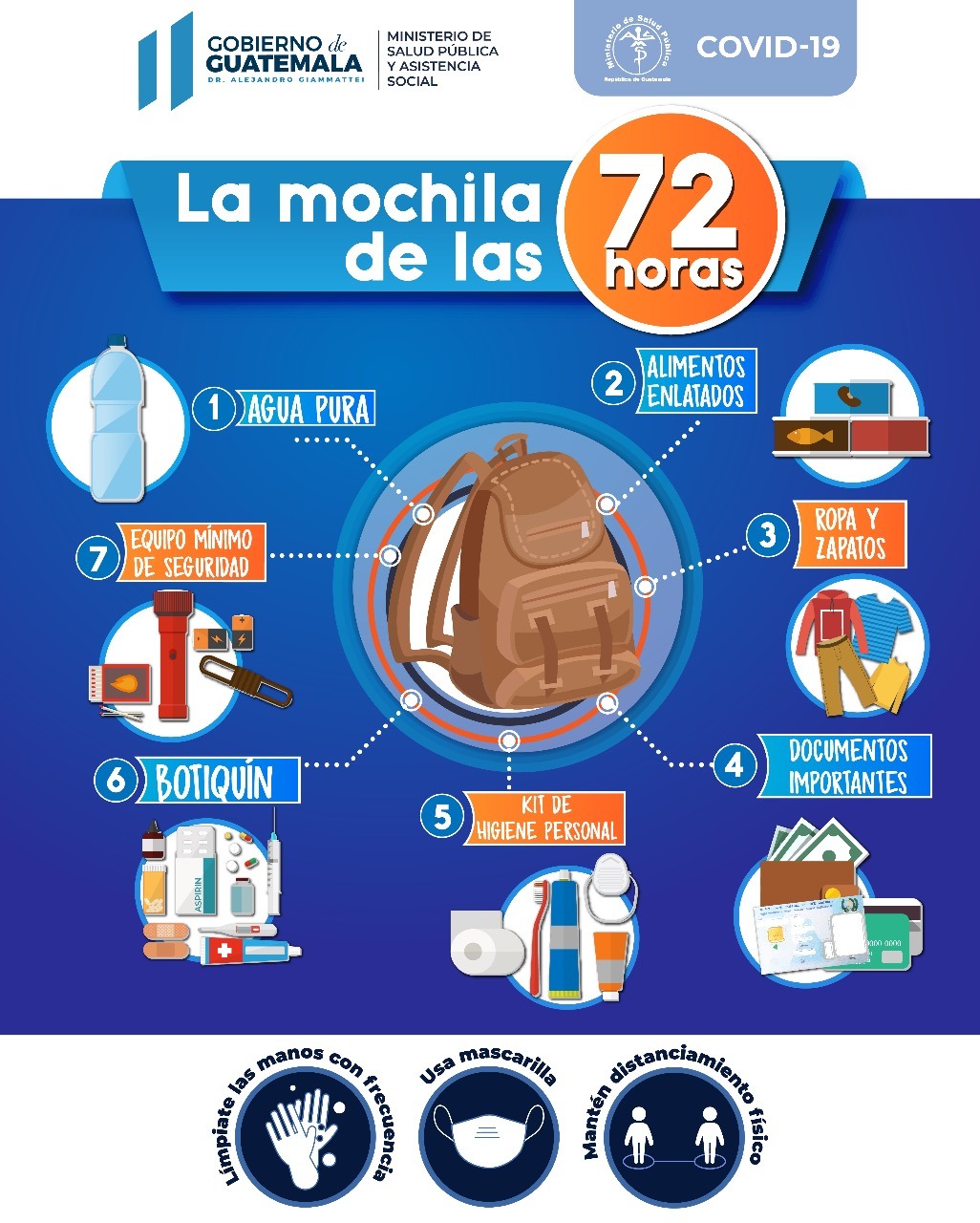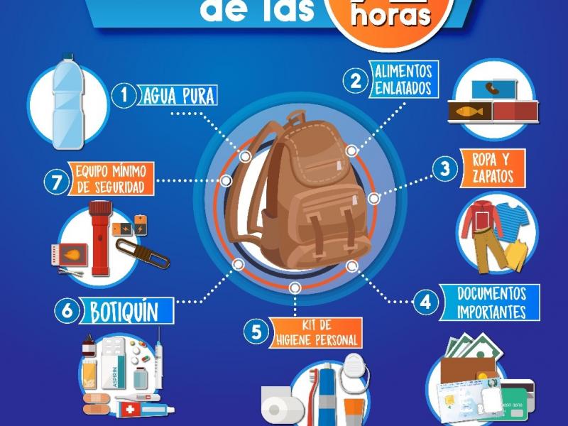 • Mochila de las 72 horas, debe incluir: alimentos enlatados, agua pura, ropa, kits de limpieza personal, botiquín familiar de primeros auxilios y los medicamentos que la familia debe de ingerir a diario (enfermos crónicos).