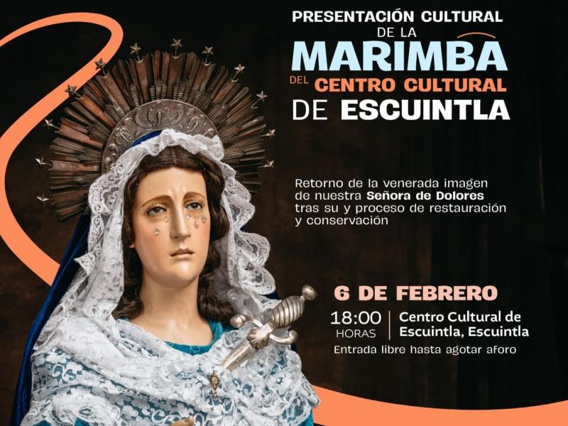 Celebremos el retorno de la venerada imagen de Nuestra Señora de Dolores, tras su proceso de restauración y conservación, con un concierto especial de la Marimba del Centro Cultural de Escuintla.