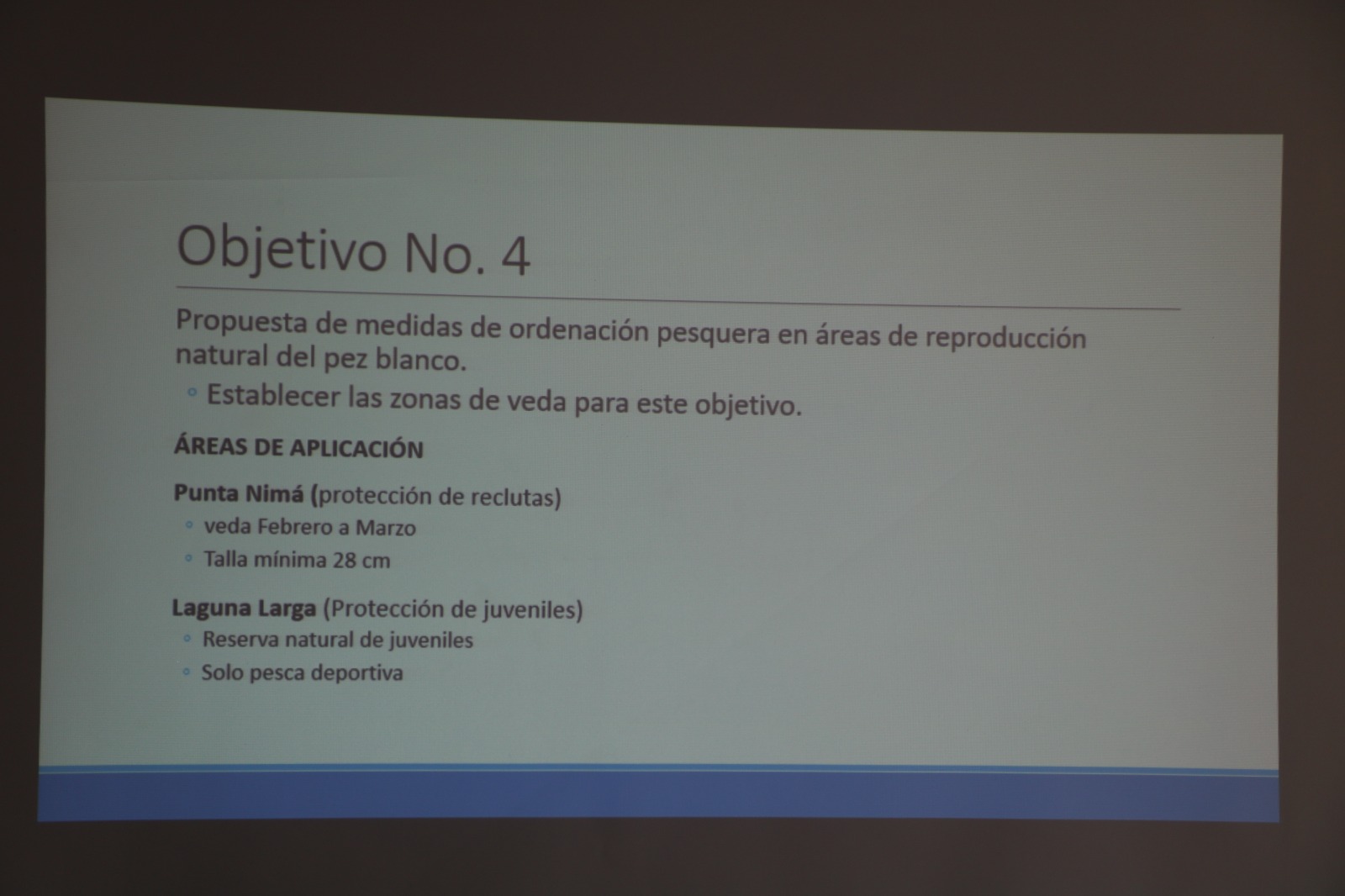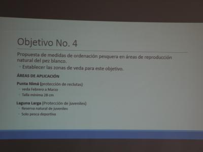 Los resultados preliminares fueron expuestos por la Darling Hermosilla, encargada de Investigación del Departamento de Pesca Continental y Acuicultura, del Ministerio de Agricultura, Ganadería y Alimentación (MAGA). El objetivo principal del proyecto es fortalecer la población del pez blanco mediante la protección de sus áreas de reproducción natural en el lago Petén Itzá.