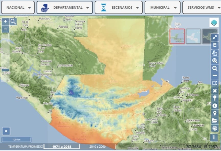 Se trata de una plataforma que permite visualizar información georreferenciada de vulnerabilidad y adaptación, así como de mitigación, entre otros temas, que se convierte en una fuente de información preventiva para la toma de decisiones y la planificación estratégica, tanto al Gobierno como a otros actores relevantes, que forman parte del Consejo Nacional de Cambio Climático, presidido por el señor Presidente, Dr. Alejandro Giammattei.