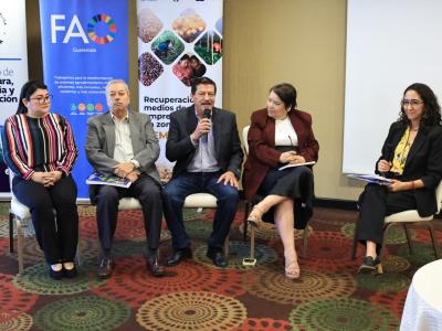 El acto protocolario contó con la participación de Mario Alberto Gaitán, viceministro de Seguridad Alimentaria y Nutricional; Rafael Zavala, representante residente de la FAO en Guatemala; y Cindy Pérez, directora de Cooperación Externa de la Secretaría de Seguridad Alimentaria y Nutricional (SESAN), quienes resaltaron la importancia de la guía para articular la producción de alimentos con una nutrición adecuada y sostenible.