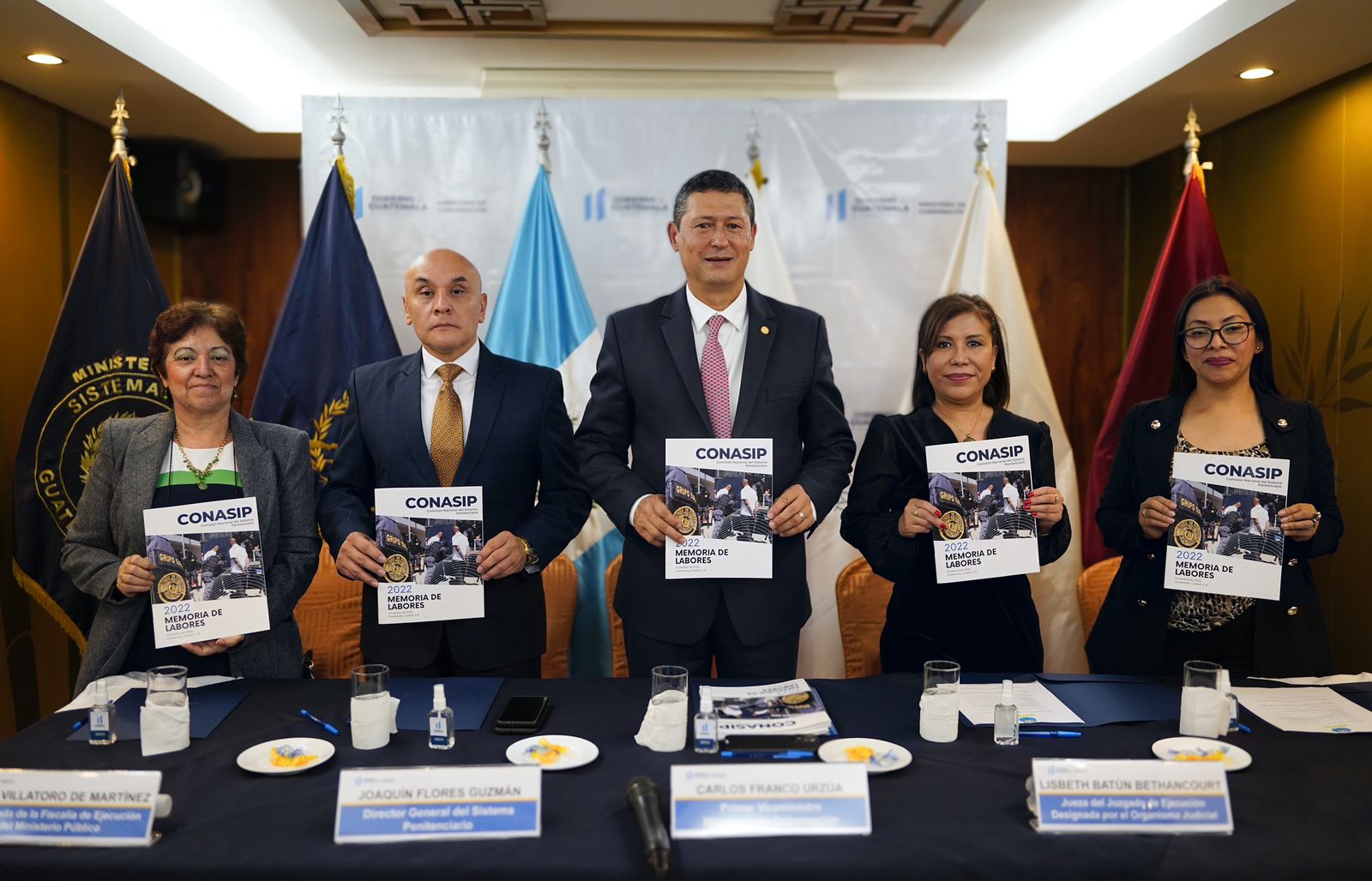 El Primer Viceministro de Seguridad, Carlos Enrique Franco Urzúa, junto al Director del Sistema Penitenciario, Joaquín Flores, la encargada de la Fiscalía de Ejecución del Ministerio Público (MP), Gilda Villatoro, la jueza del Juzgado de Ejecución designada por el Organismo Judicial (OJ), Lisbeth Batún y la encargada de la Coordinación de Ejecución del Instituto de la Defensa Pública Penal (IDPP), Alma Martínez Ambrosio, participaron en la presentación de la Memoria de Labores 2022, de la Comisión Nacional del Sistema Penitenciario.