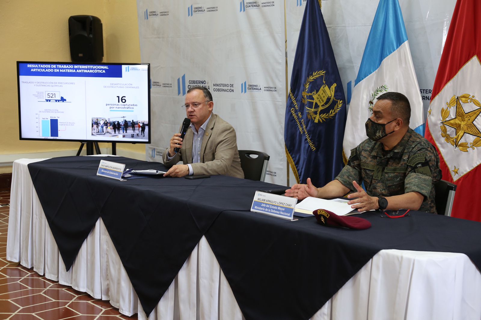 El ministro de Gobernación, David Napoleón Barrientos y el Jefe del Estado Mayor del Ministerio de la Defensa Nacional, William López Chay informaron sobre los resultados de los decomisos de dinero en efectivo, bienes incautados y erradicación de plantaciones ilícitas, lo que ha permitido impactar las finanzas de las estructuras del narcotráfico durante el presente año.