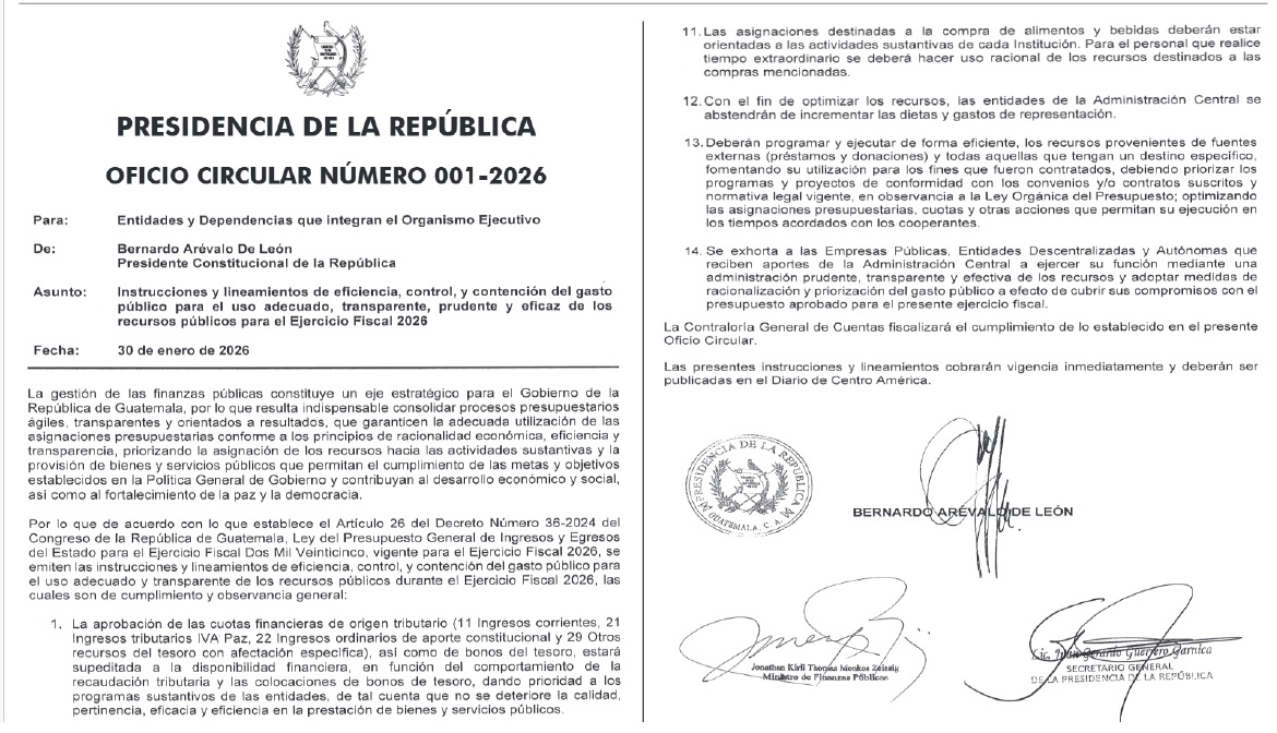 Mediante el Oficio Circular 001-2026, publicado el 30 de enero en el Diario de Centro América, la Presidencia de la República de Guatemala instruye a las entidades y dependencias del Organismo Ejecutivo a aplicar medidas de eficiencia, control y contención del gasto público durante el ejercicio fiscal 2026.